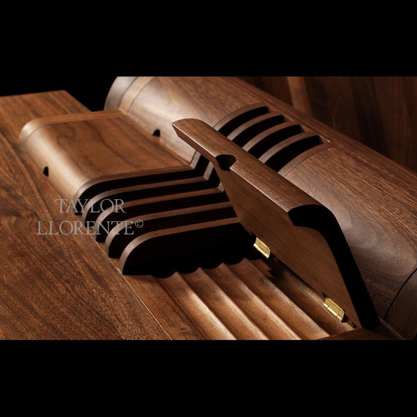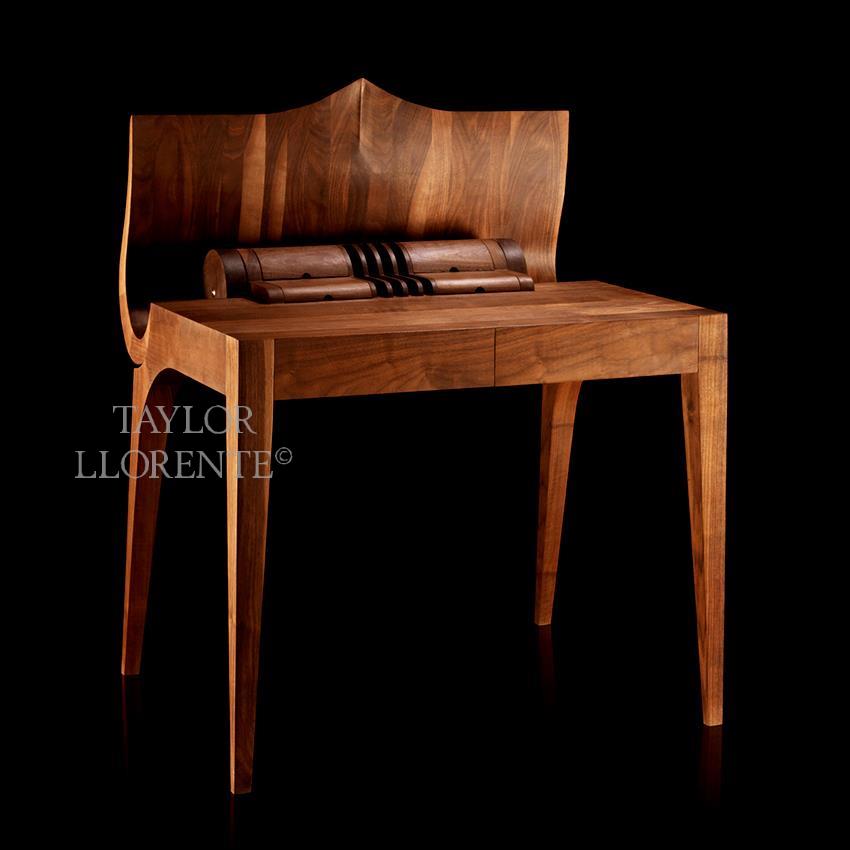 This sculptural walnut desk forms part of a high profile sculptural furniture collection which focuses on design innovation and 'joinery engineering'.