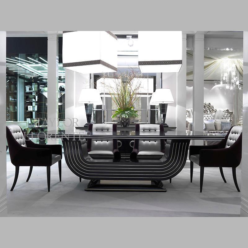 A high end specification architectural dining table in high gloss mirror finish lacquer with linear inlaid silver detailing on table base and perimeter of table top.