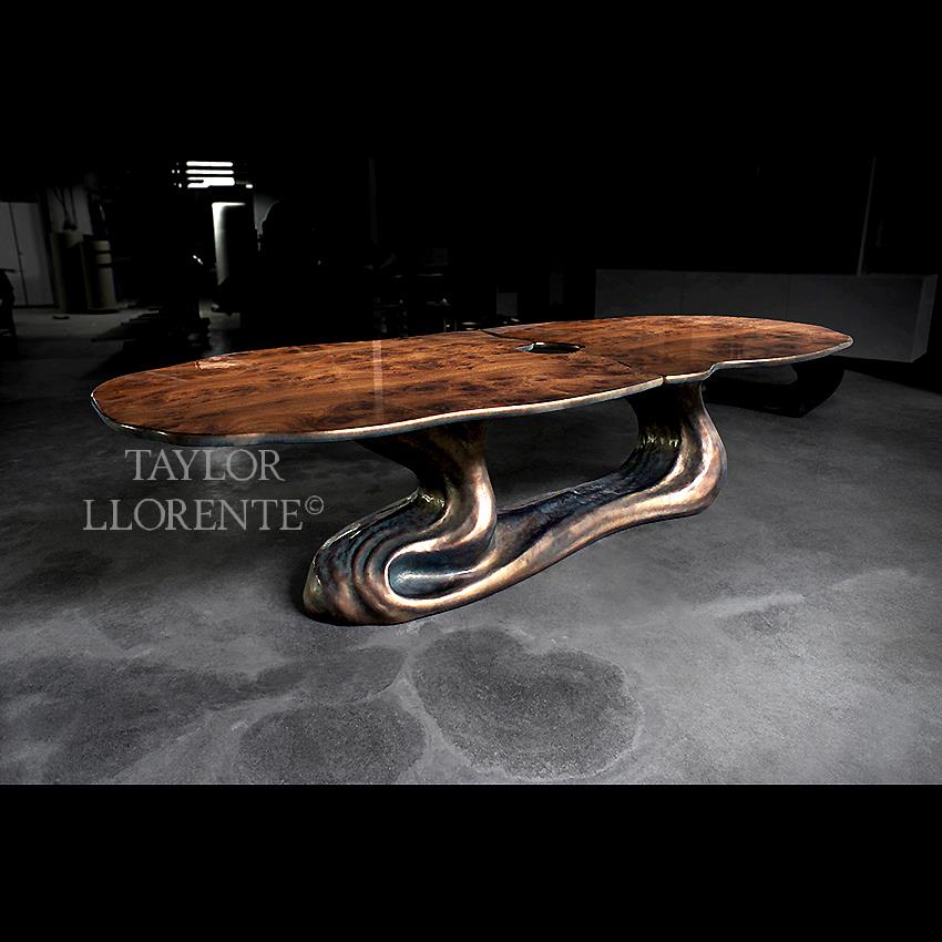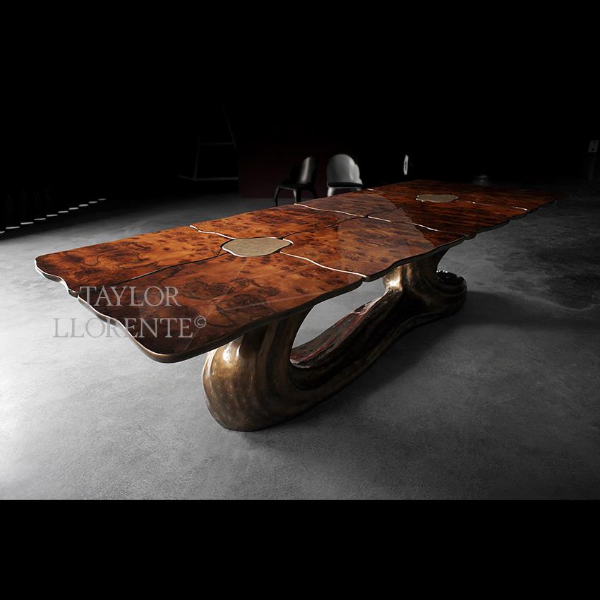 A high end luxurious dining table created with sculptural table base and burr walnut top.