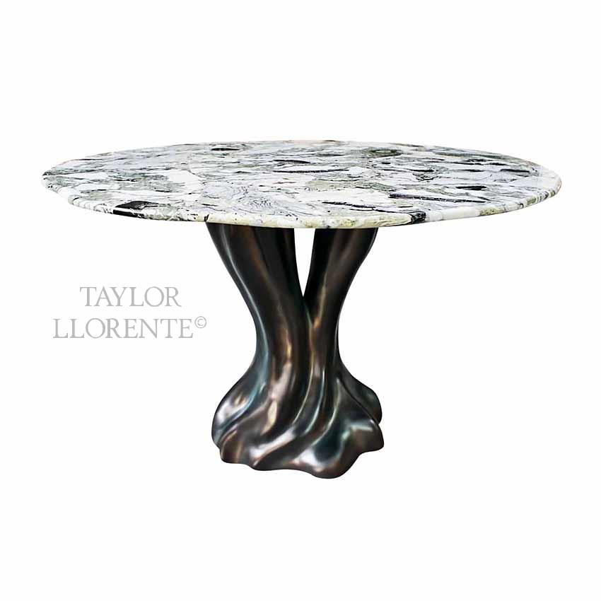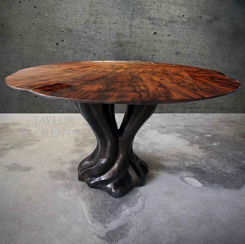 Small dining table with sculptural base created in fiberglass and resin finished as pictured in Bronze lustre.