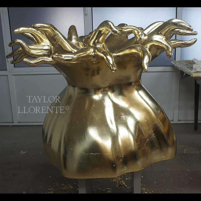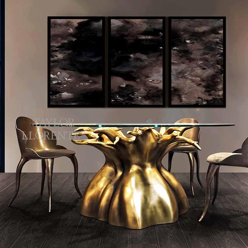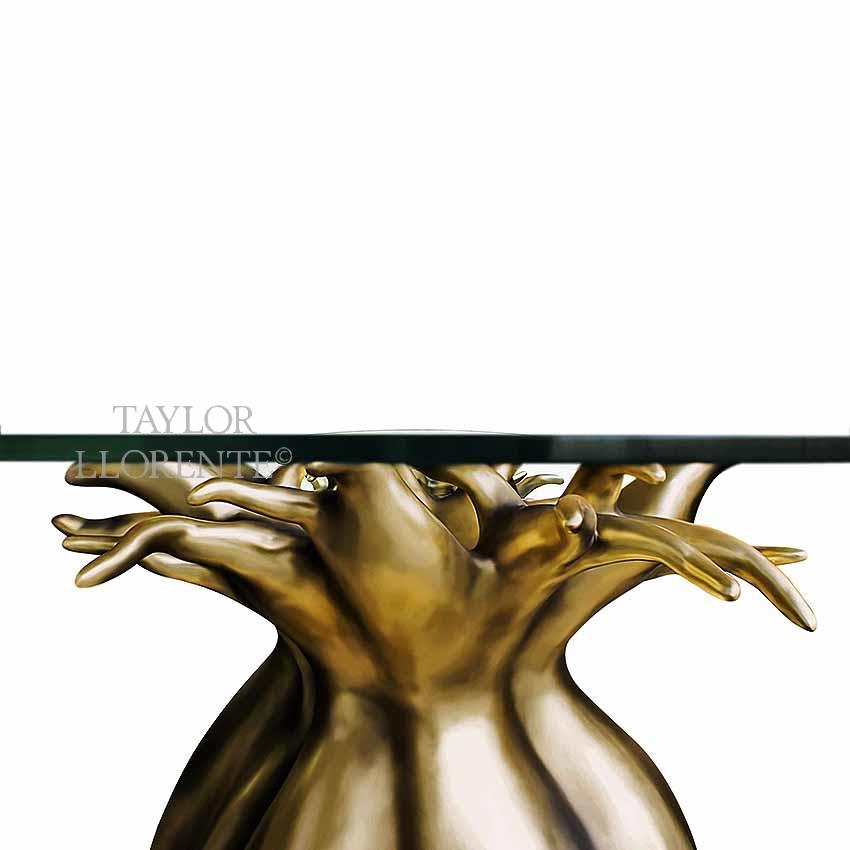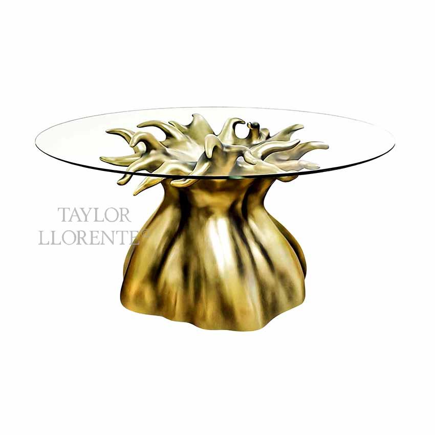A unique and differentiated dining table with sculptural base pictured with hand applied gold leaf and 12mm clear tempered glass table top. Base created in resin reinforced with fiberglass.