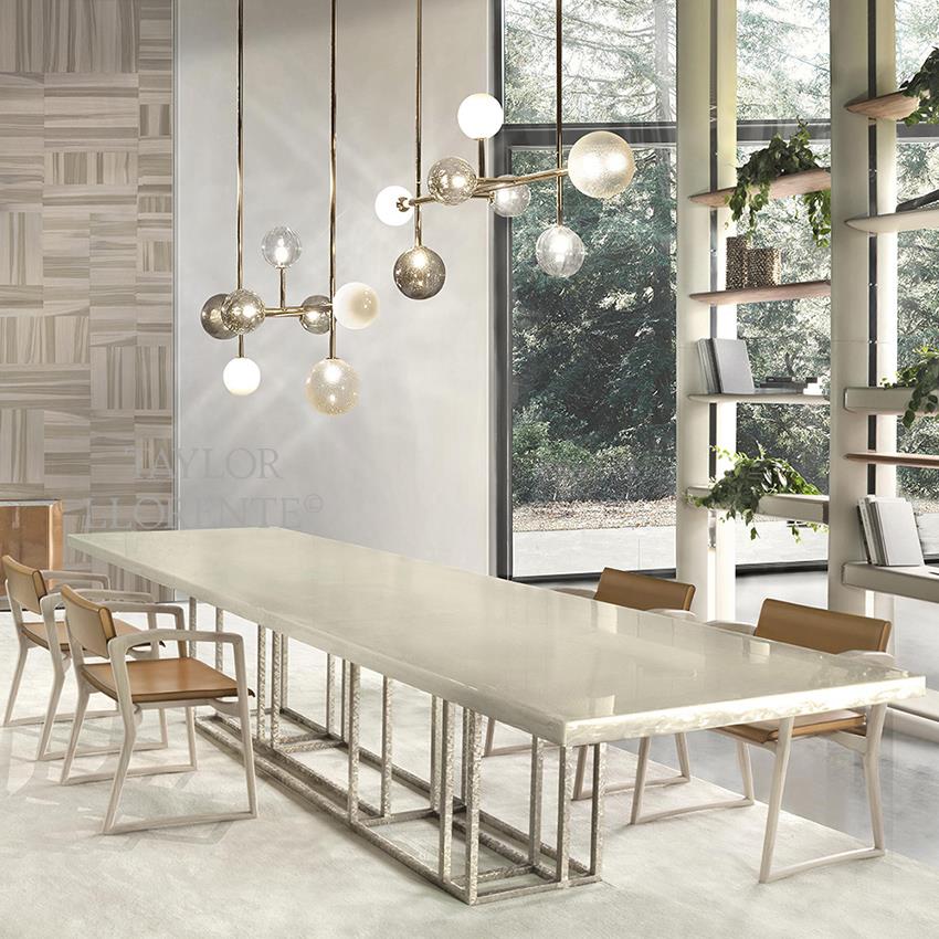 This metal structure is complimented by the extravagant yet restrained table top created in resins, coloured pigments and natural elements to create this lustrous finish to the top.
