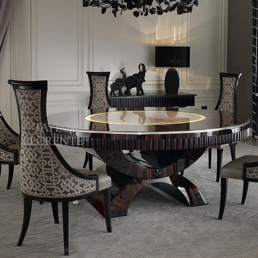 A unique luxurious dining room table worked as pictured in highly specified and figured macassar ebony finished by hand in a high gloss combined with high gloss black lacquer elements.