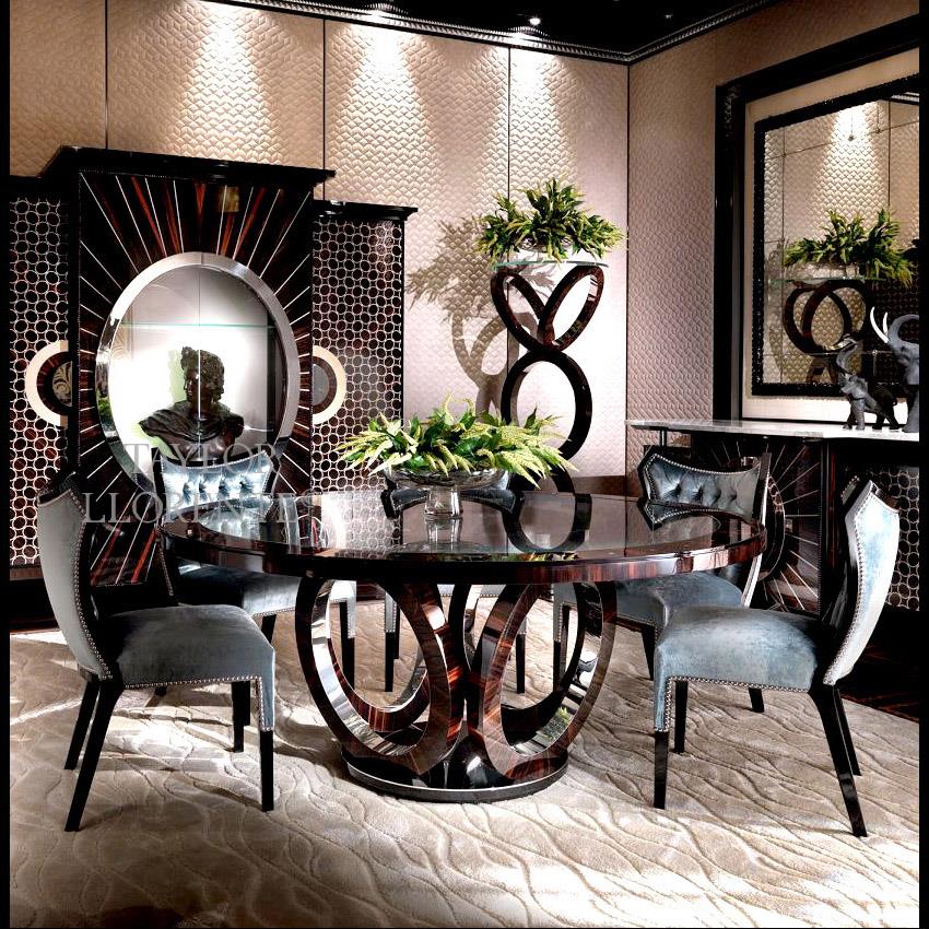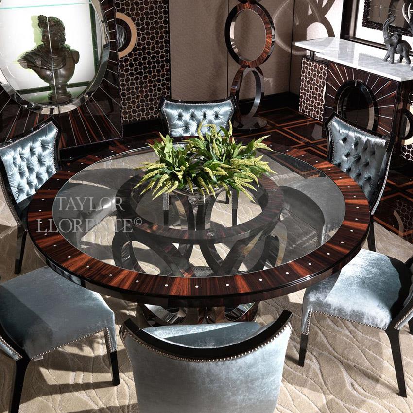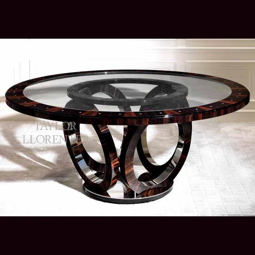 Macassar ebony round dining table with inset glass top and silver detailing on parameter of table top. .
