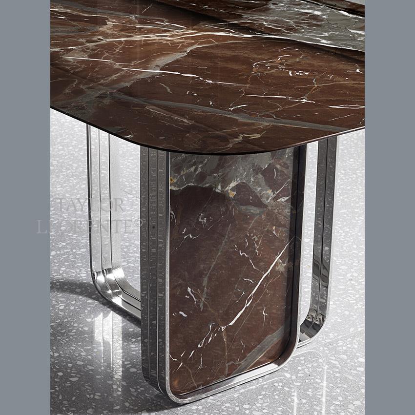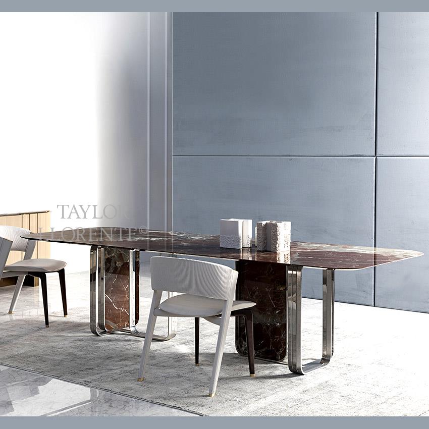 Architectural design dining table created with metal framework. Base of table fitted with marble panels and marble table top.