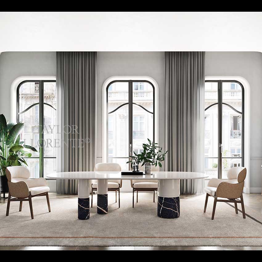 Contemporary dining room table created with luxurious Italian marble base and wood table top.