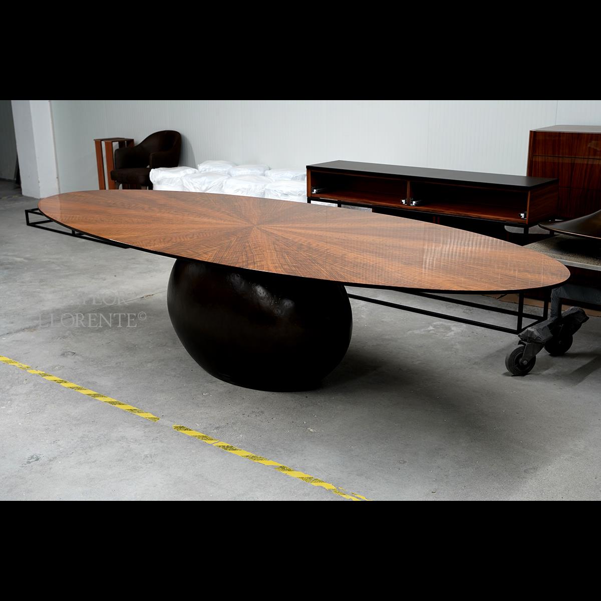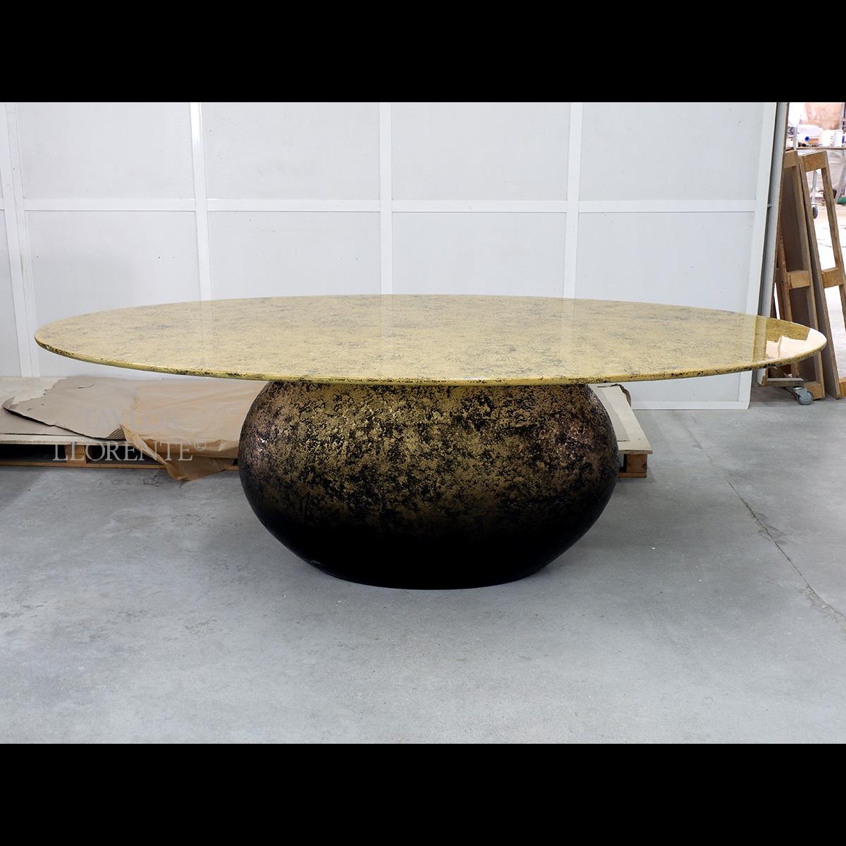 Table base moulded in resin reinforced with fiberglass, finished with gradient gold leaf to a matt black, with texture.