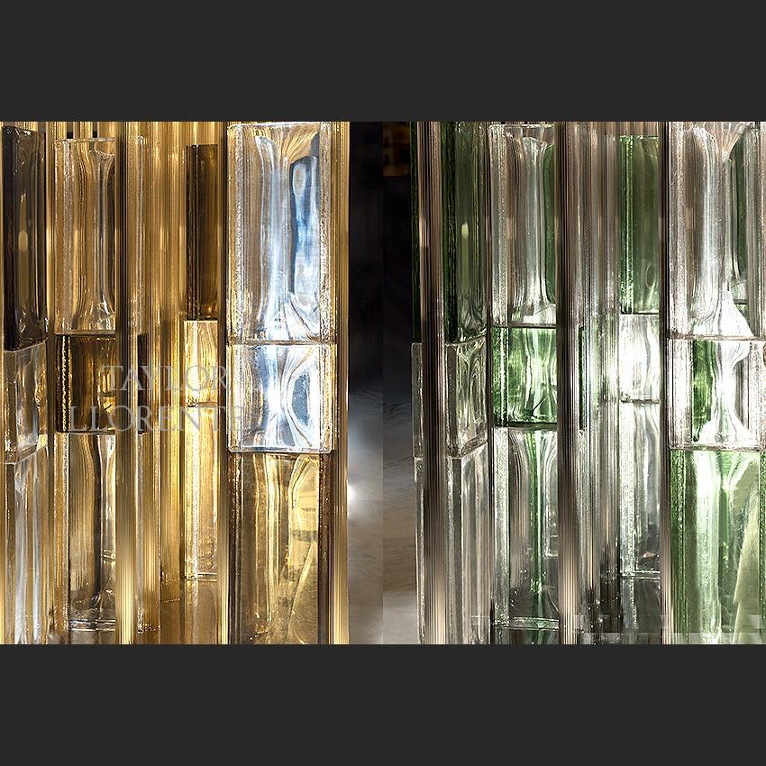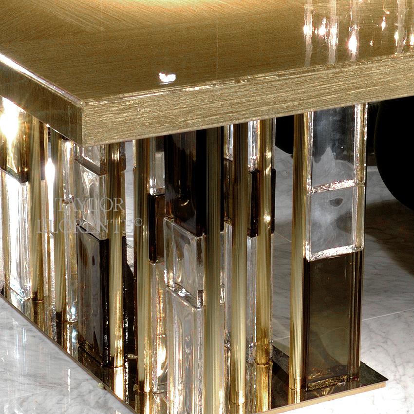 The wonderfully unique and differentiated and highly stylised table base is worked by hand in architectural Murano glass rectangles created ‘one by one’. The exquisite Murano glass rectangles are available in clear-transparent Murano glass, smoked colour and or green colour Murano glass on request.