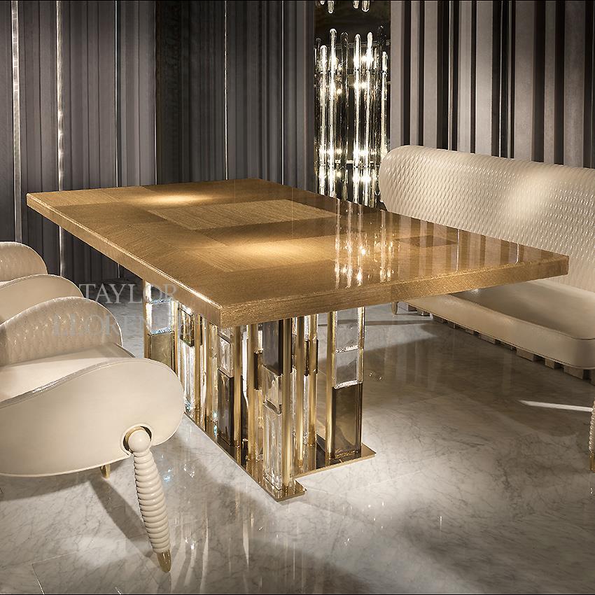 A hand sculptured dining table created with sections of Murano glass and gold detailing.