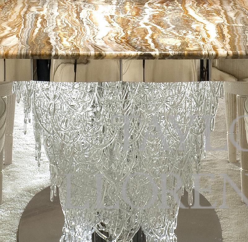 A dazzling & spectacular ’gallery’ table with an exuberant abundance of Murano glass ‘spiders web’ pendants clustered around the base of this table. Top of dining table as pictured is a solid piece of highly specified polished Travertine onyx. Also available in yellow onyx with a small up charge.