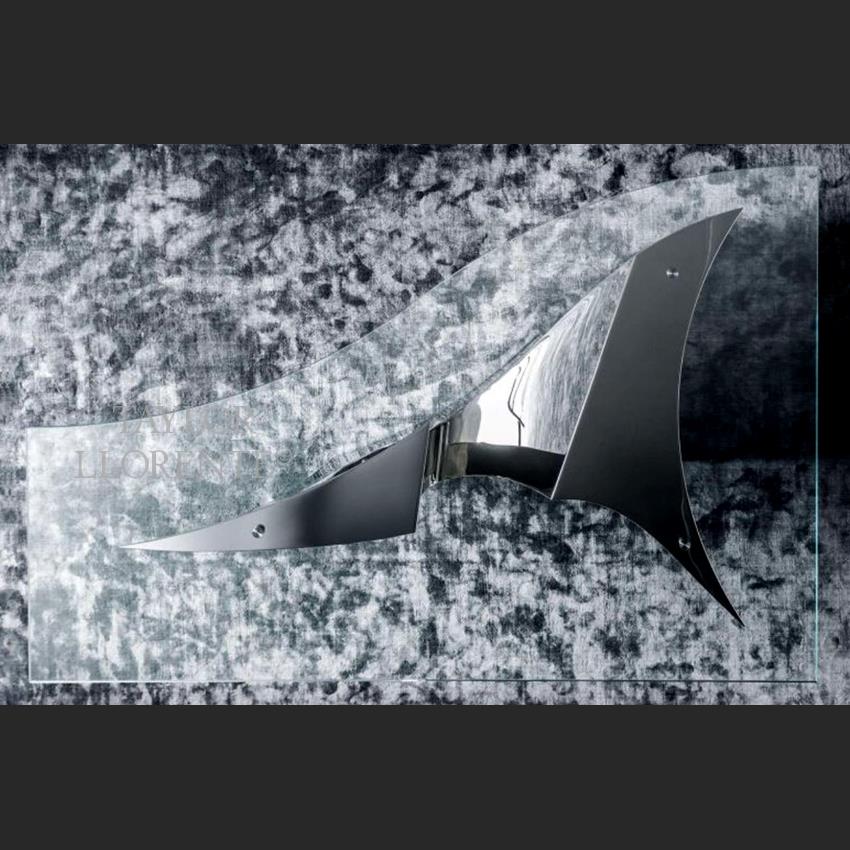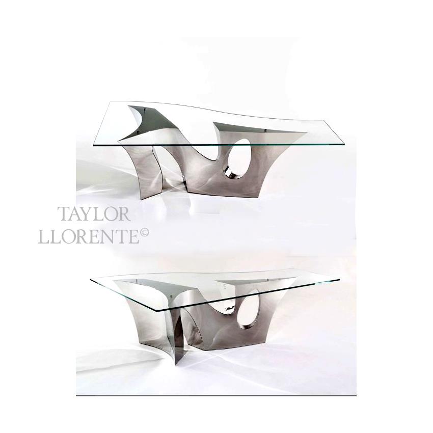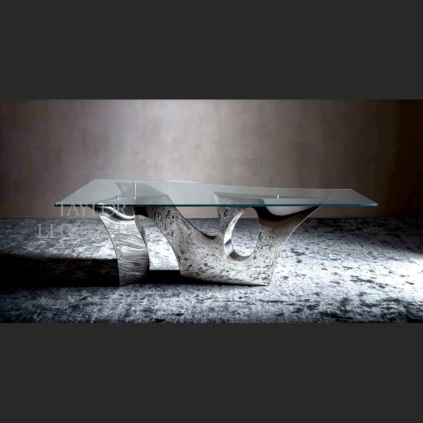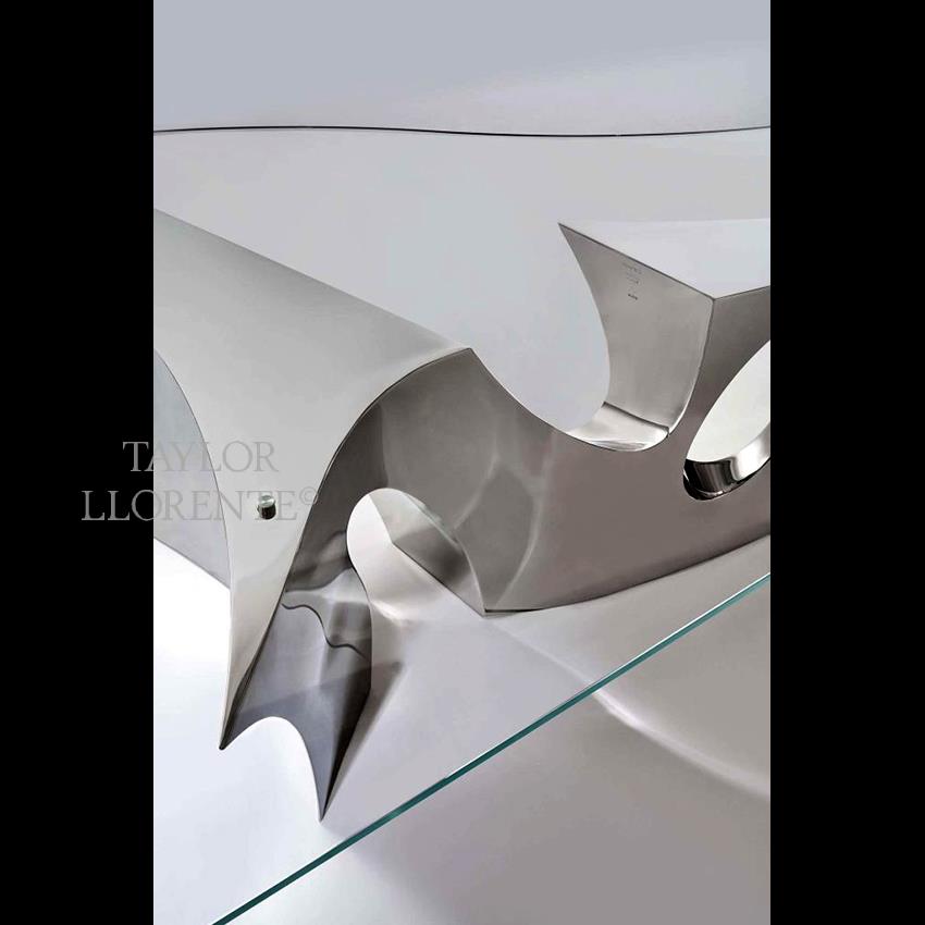 An important limited edition Gallery ‘Work of Art; sculptural table forged in high polished stainless steel and with clear glass table top.