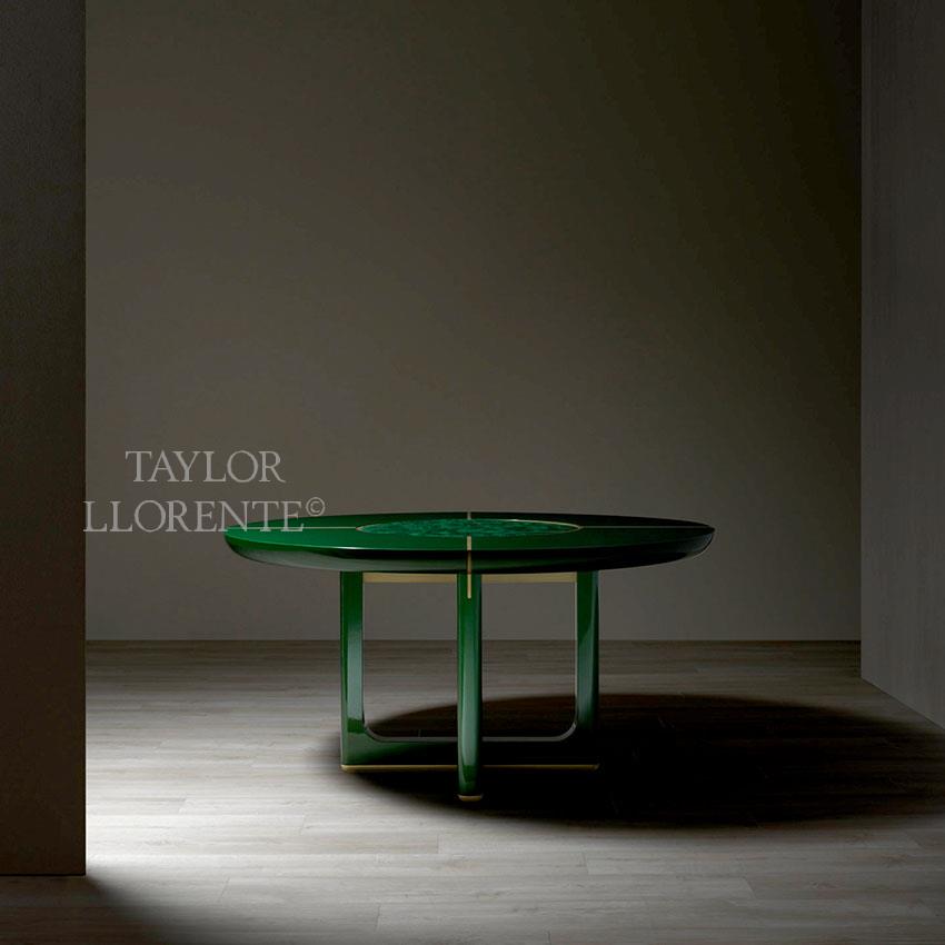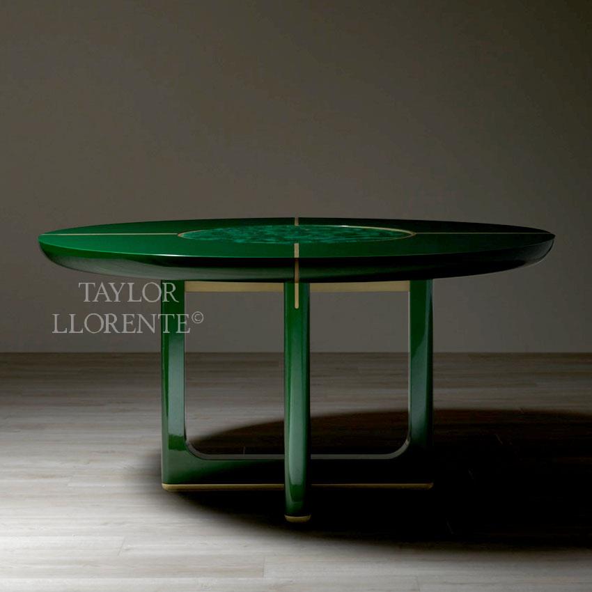 A luxurious design round table finished here in high specification emerald colour lacquer work and detailed with inlaid metal parts and central ‘lazy Susan’ created in decorative malachite as pictured.