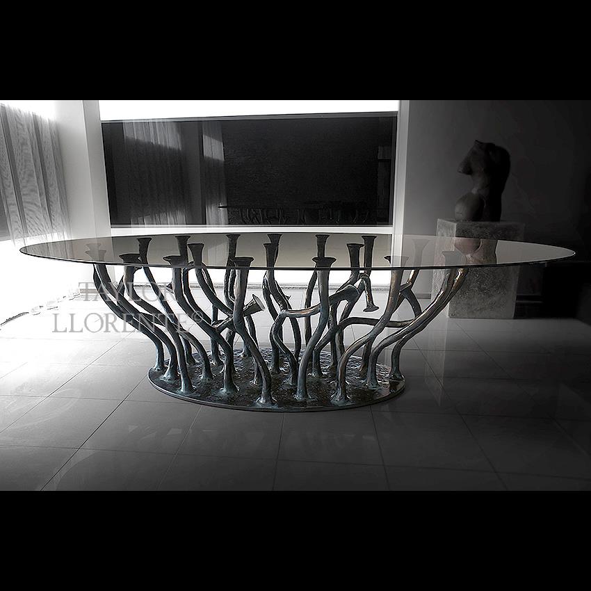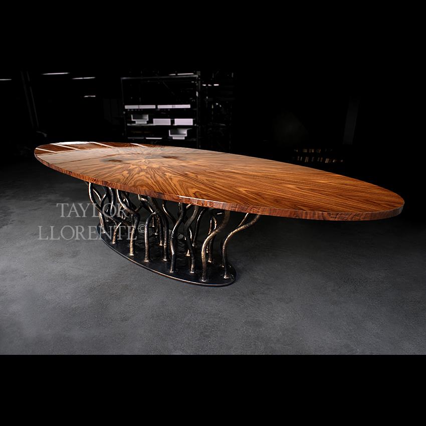 A rare and unique dining table with burr walnut and fibreglass base lacquered in bronze finish. Main illustration.