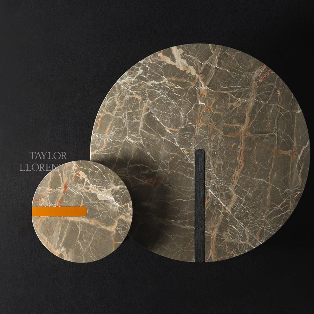 Table top, base plate and thick vertical support available in combination of the following finishes. Lacquered wood RAL colour, Wood veneers, Marble or Lacquered Metal colour bronze, pewter, copper or black). Matt or shiny finish.
