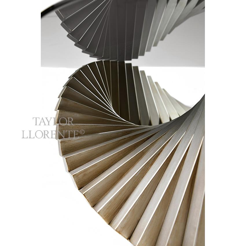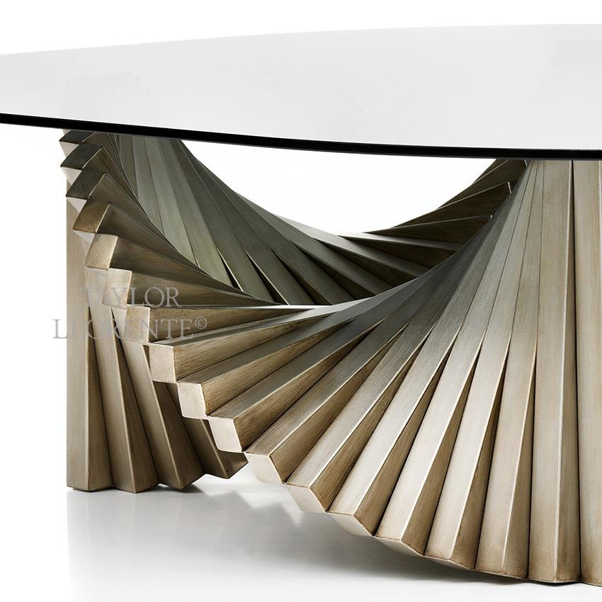 A rare design table with sculpted and fluid panelled wood base in a fan shape design in Platinum finish.