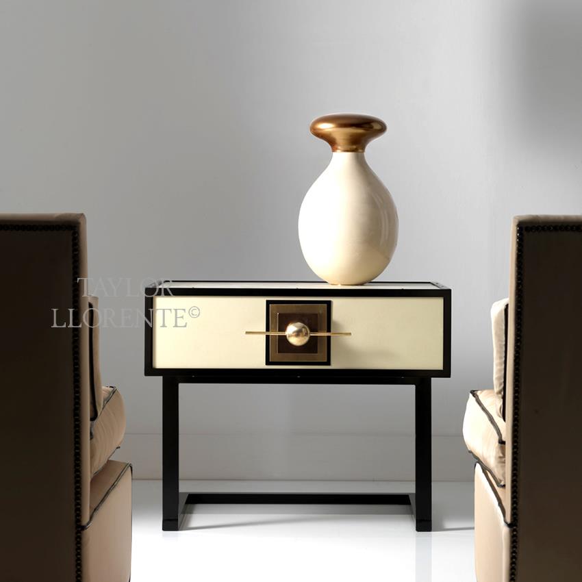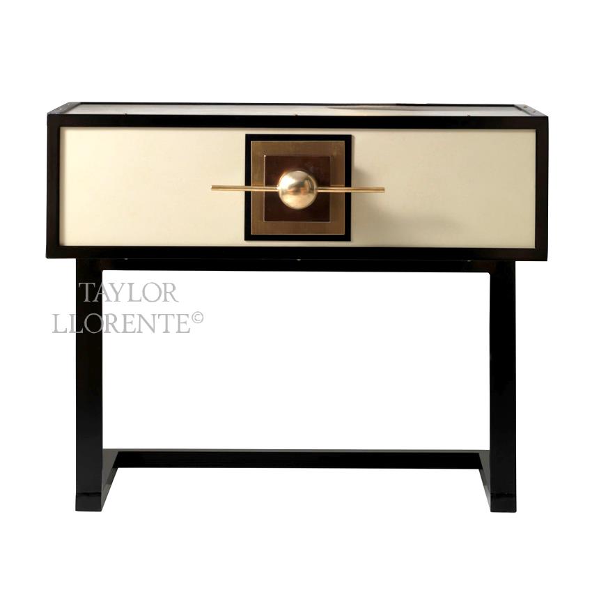 Black opaque hand lacquered brass side table with single drawer. A rare hand worked piece with exceptional detail. Opaque black lacquered brass structure with natural brass details. Top with brass stud screw detail on parameter. Ivory hand lacquered wood with drawer. Part of a unique, couture and artisan furniture collection.