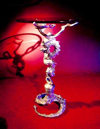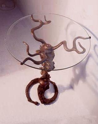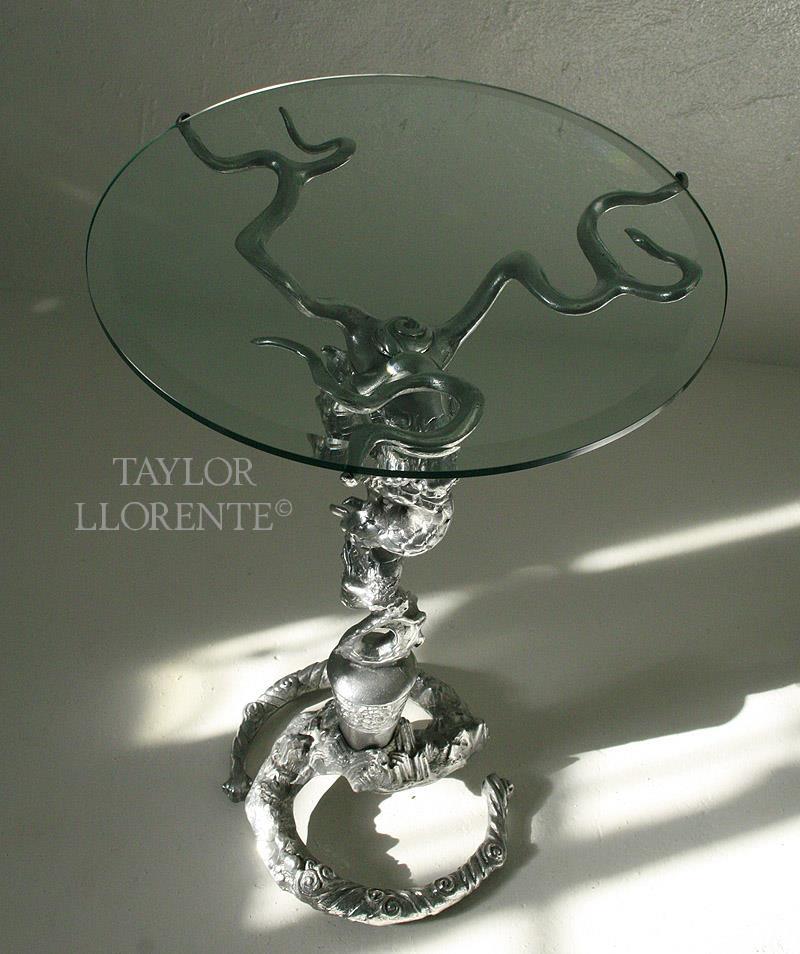 Artisan side table created in hand cast solid bronze metal. This rare piece is sculpted by an artist and is extremely rare and collectable.