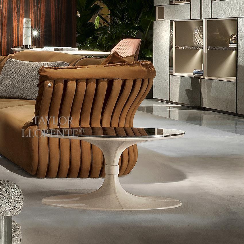 The top of this table is created with an oval shaped marble top pictured in Marron Damasco marble.