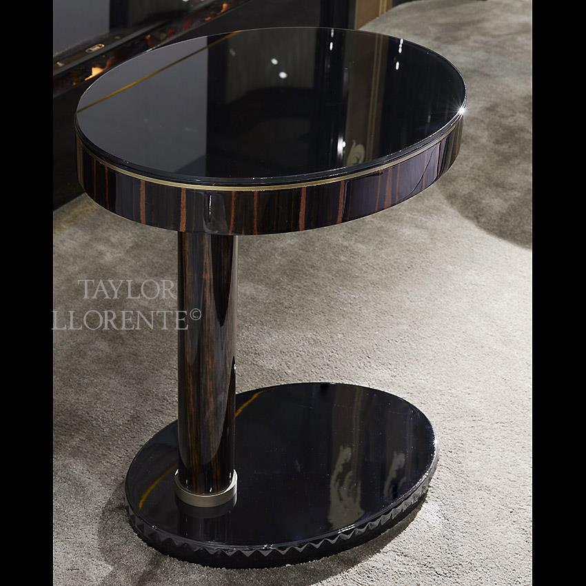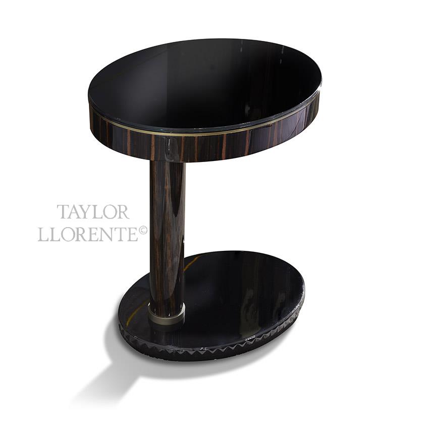 High end design side table created in luxurious Macassar ebony wood with black glass inlaid table top and brass metal detail.