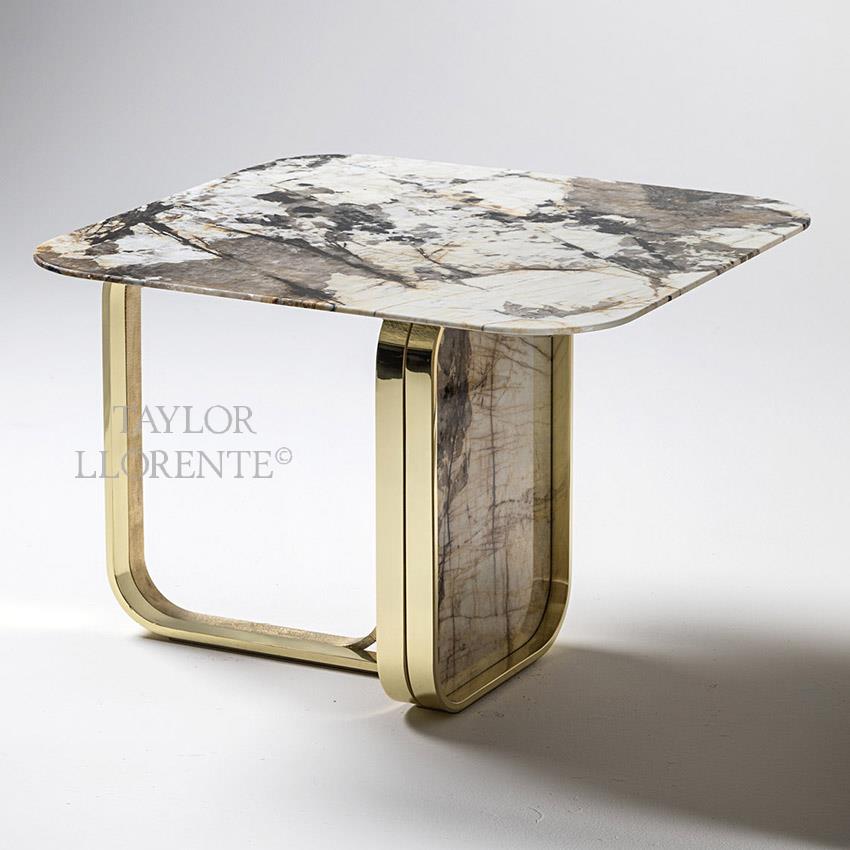 Modern design side table created with luxury etched bronze metal asymmetric frame and Italian Marble table top and base panel.