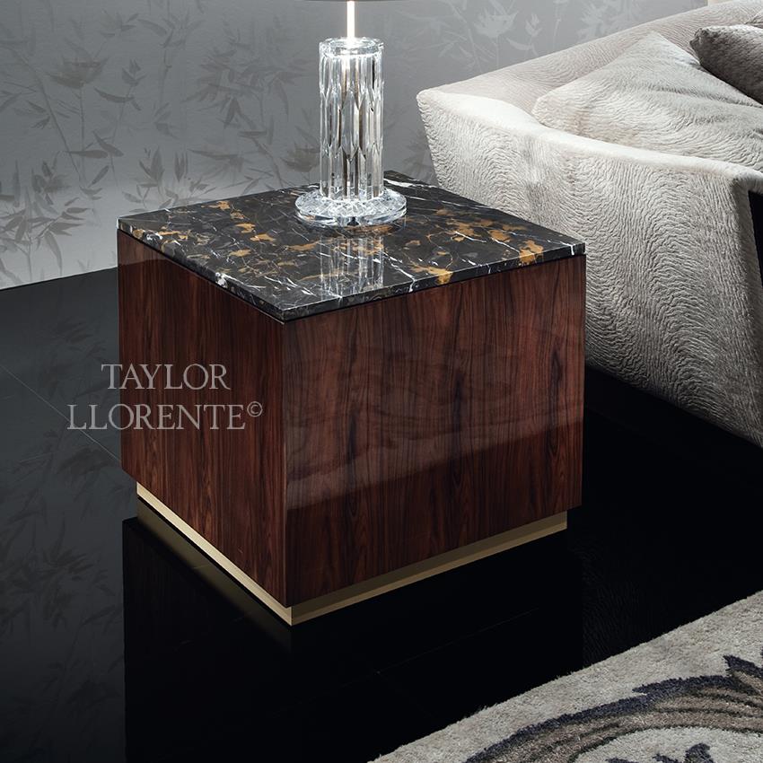 A modern luxury design side table or bedside table created in high gloss rosewood with marble top in black & gold marble. Plinth in bronzed stainless steel.