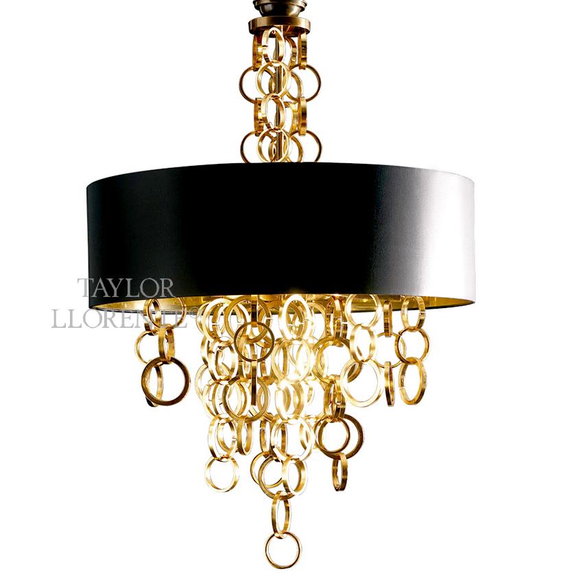 Chandelier made in brass and iron finished in gold or silver. with circular shade in black chintz with gold interior.