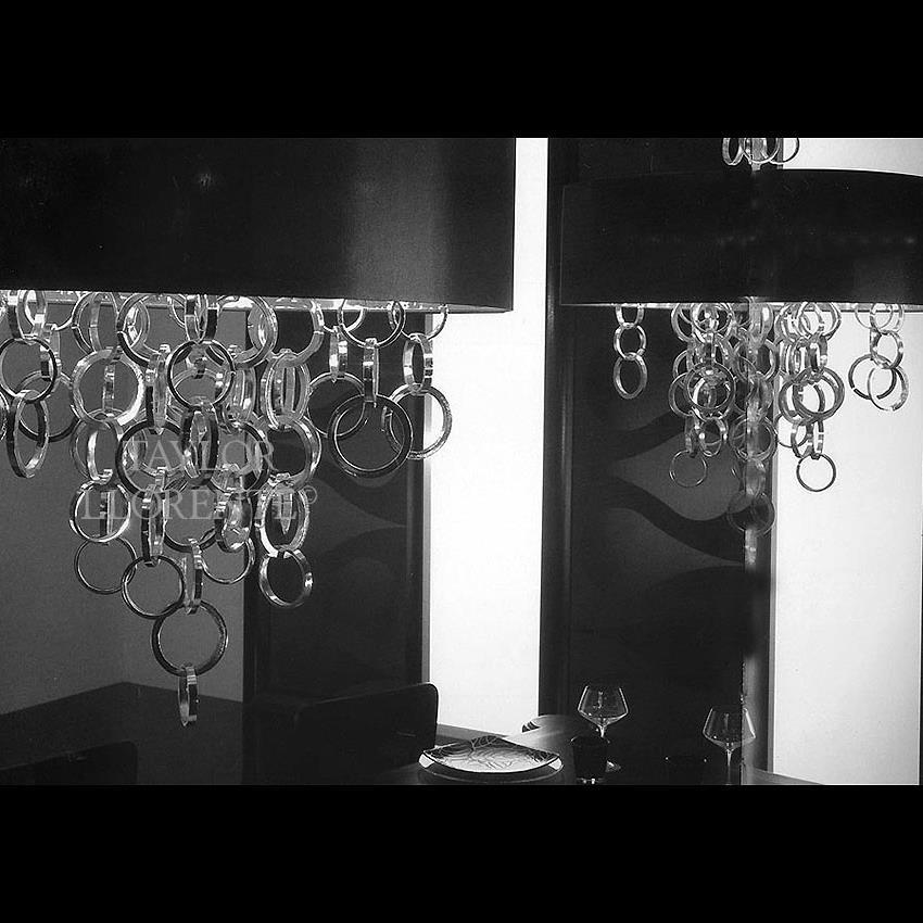 High end designer chandelier created using an abundance of hand forged metal rings finished in gold or silver.