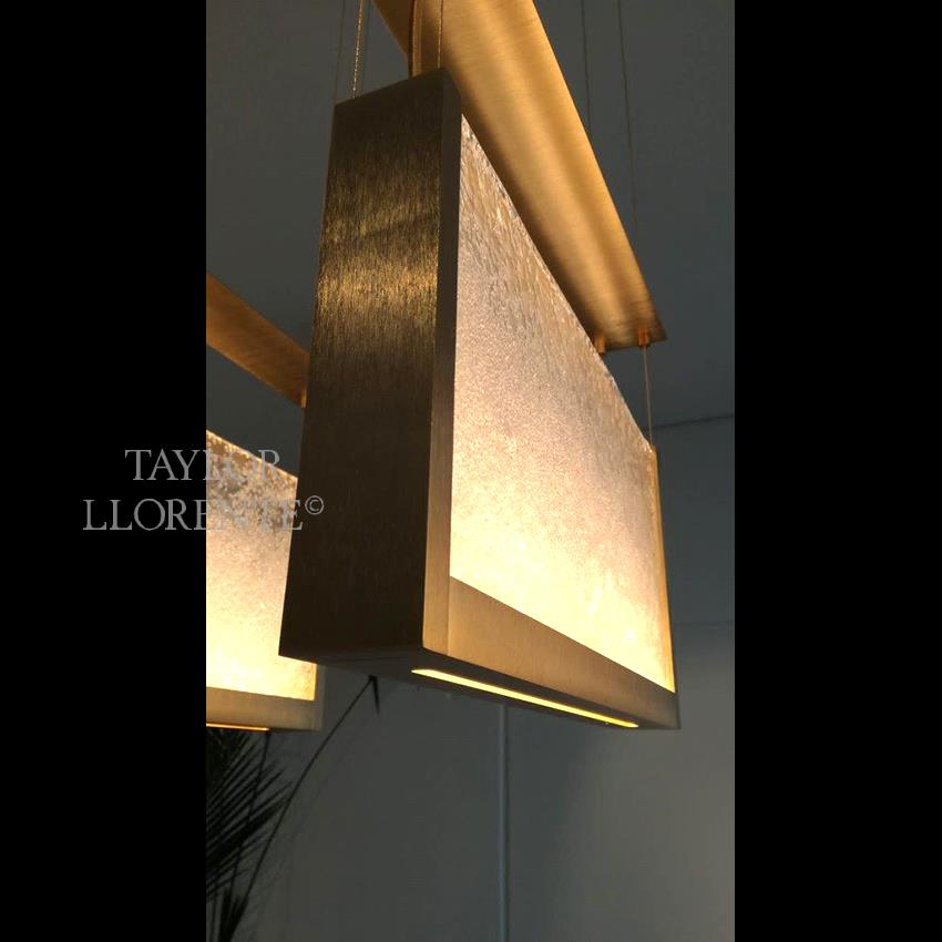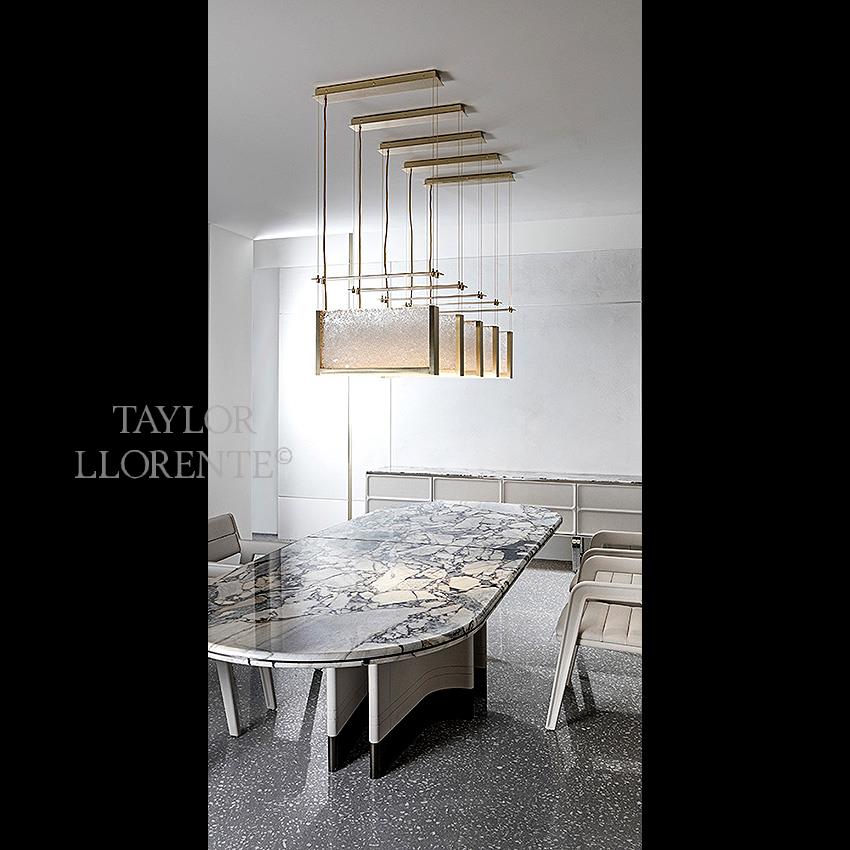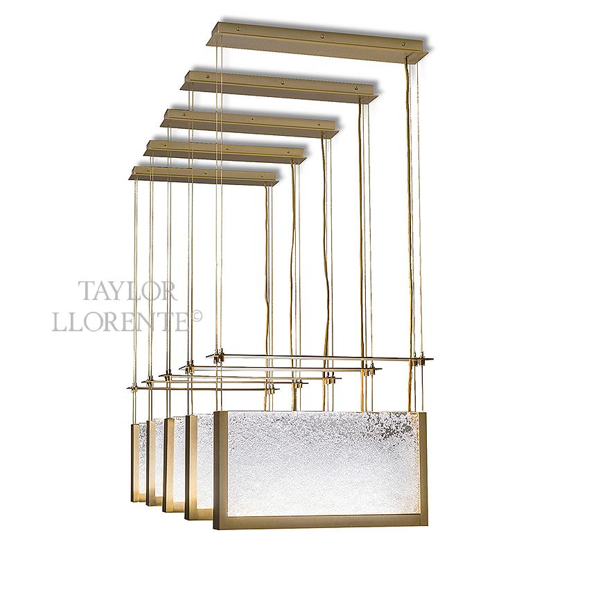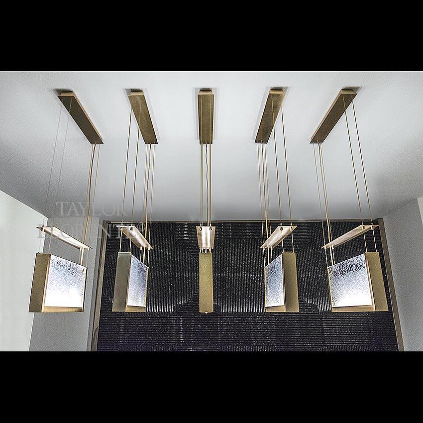 Architectural chandelier with Luxury Italian Murano glass light diffusers. This Chandelier has 5 suspension elements in gold brushed metal.