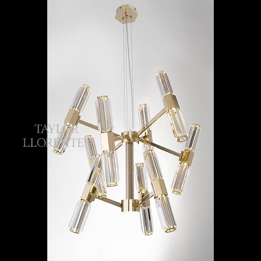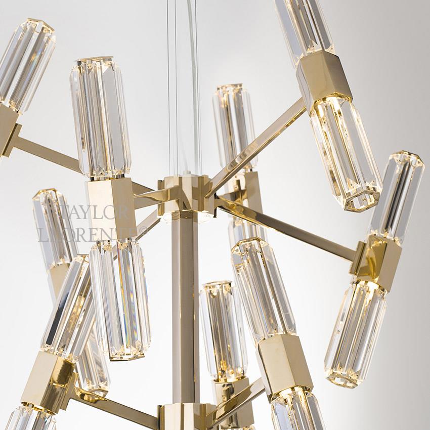 A luxurious contemporary design chandelier of architectural profile and silhouette.
