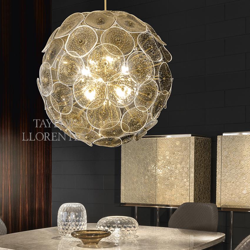 The structure of this magnificent high end designer chandelier is created with metal rods pictured here with light gold finish and fixed to the hand blown Murano glass disks of the chandelier.