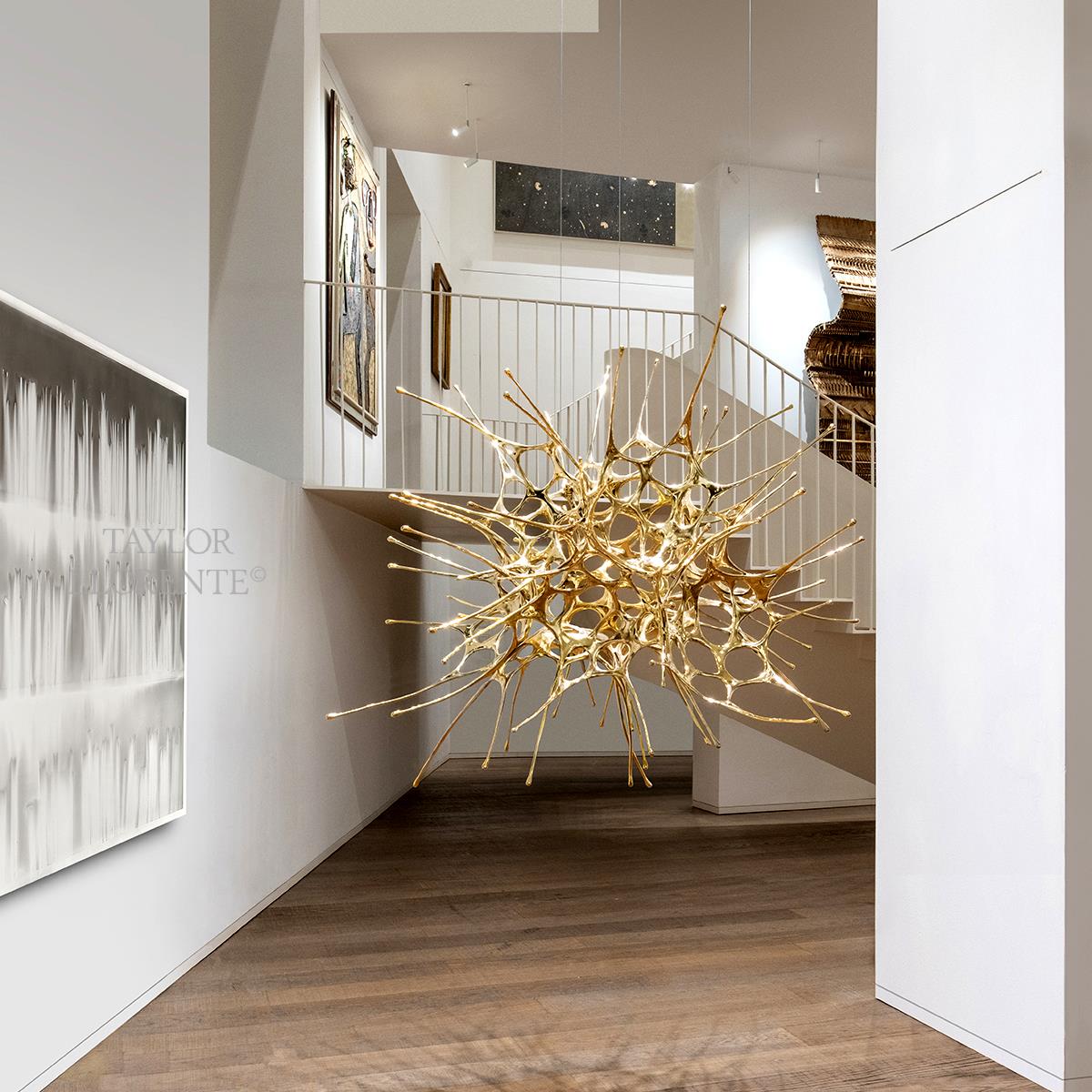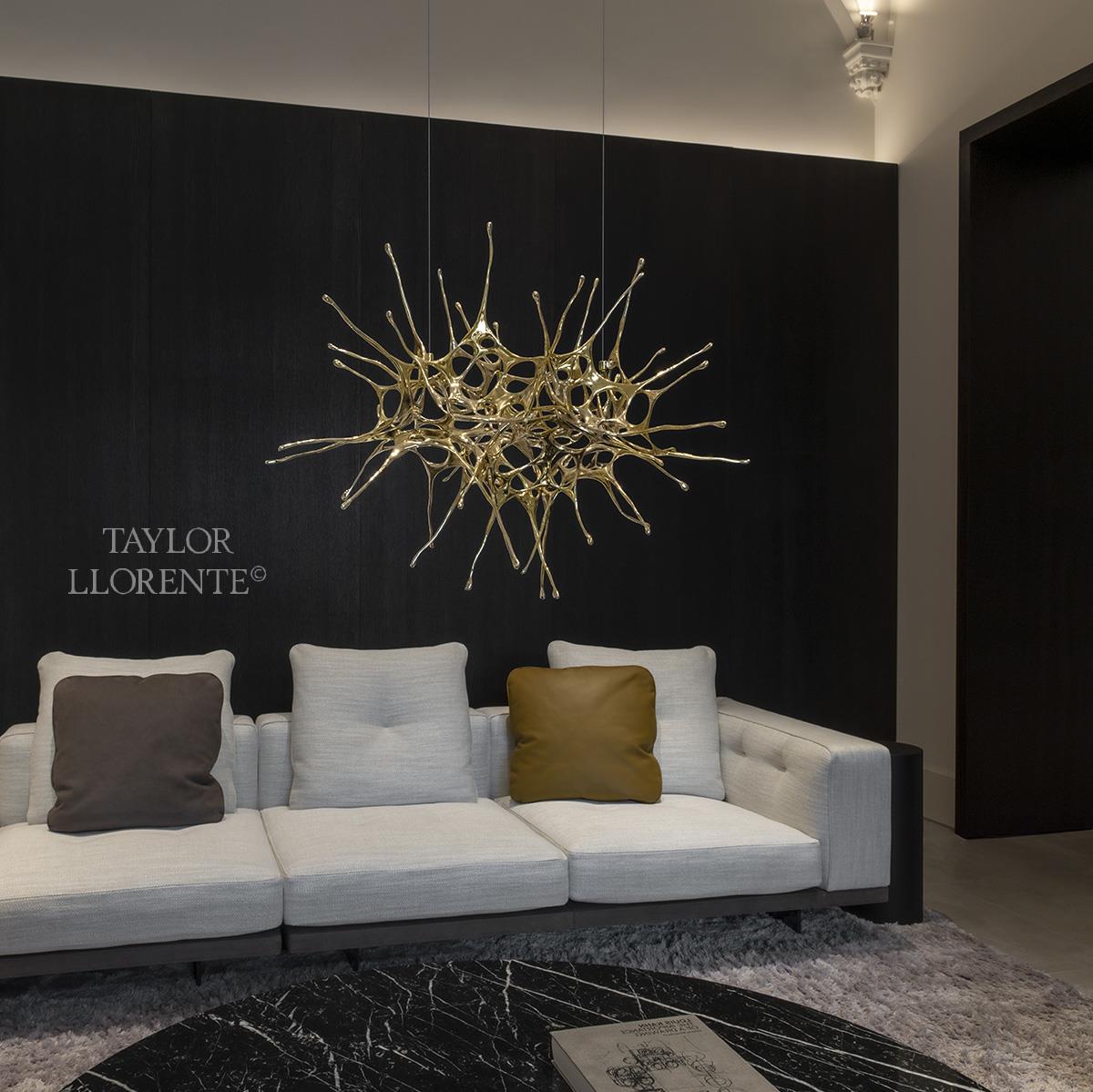 The lighting source in this unique and stylised chandelier comes from a ceiling mounted downlighter the light travelling downwards and illuminating the gold brass sculptural lamp design.