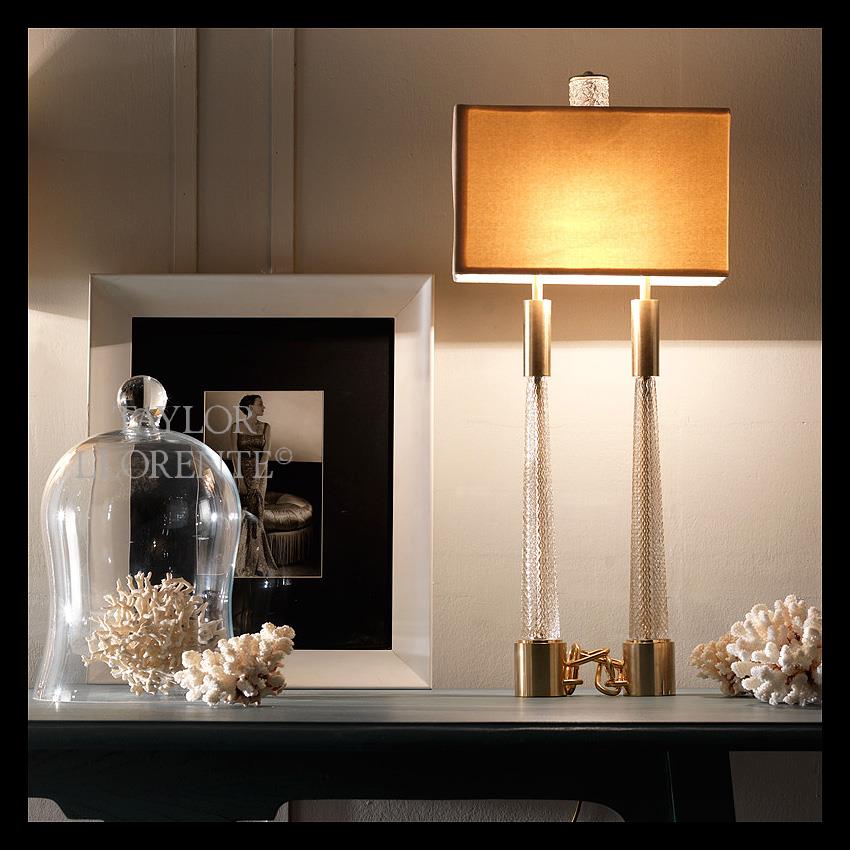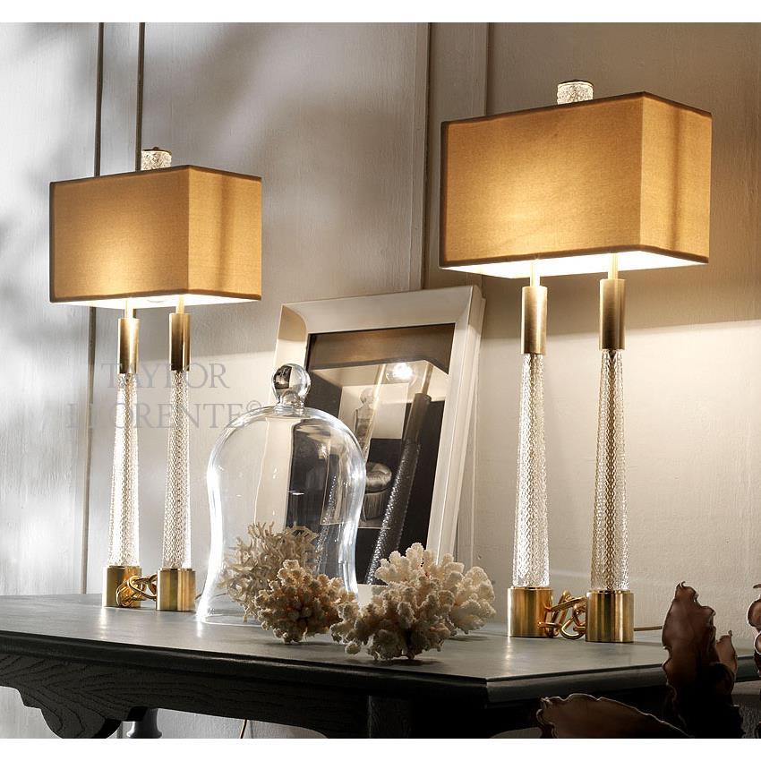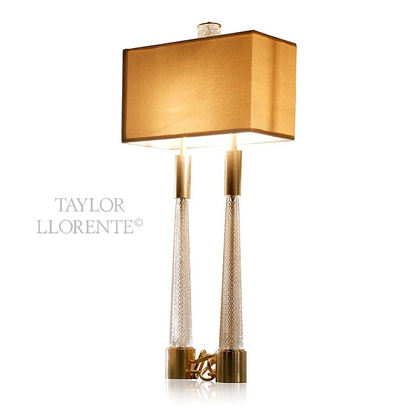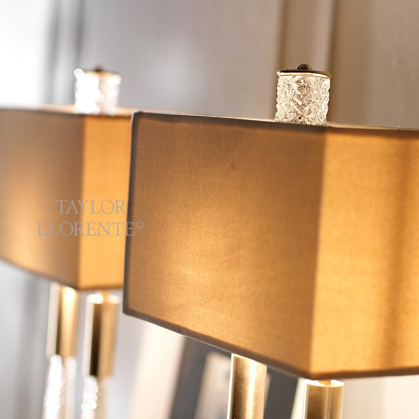 Luxurious hand cut crystal table lamps. Lamp columns in modern design crystal detailed in satin gold metal.