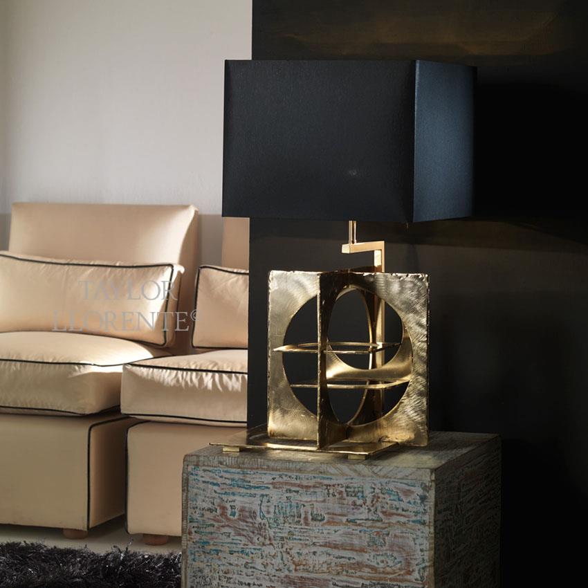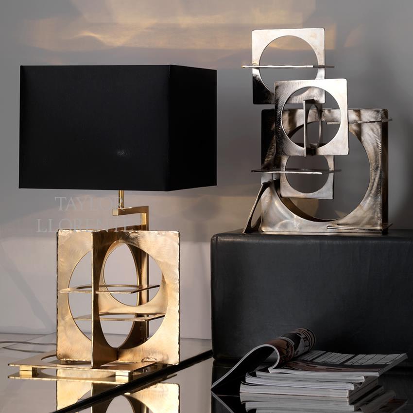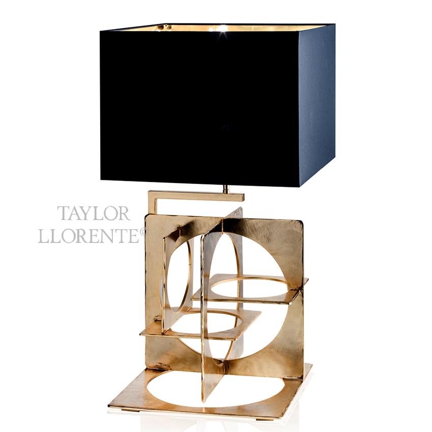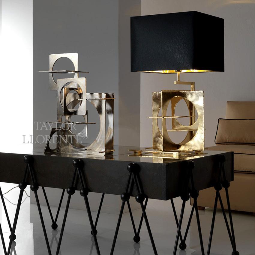 Table lamp with sculptural hand forged iron geometric three dimensional design.