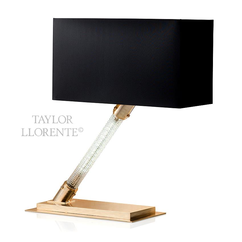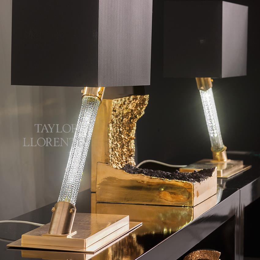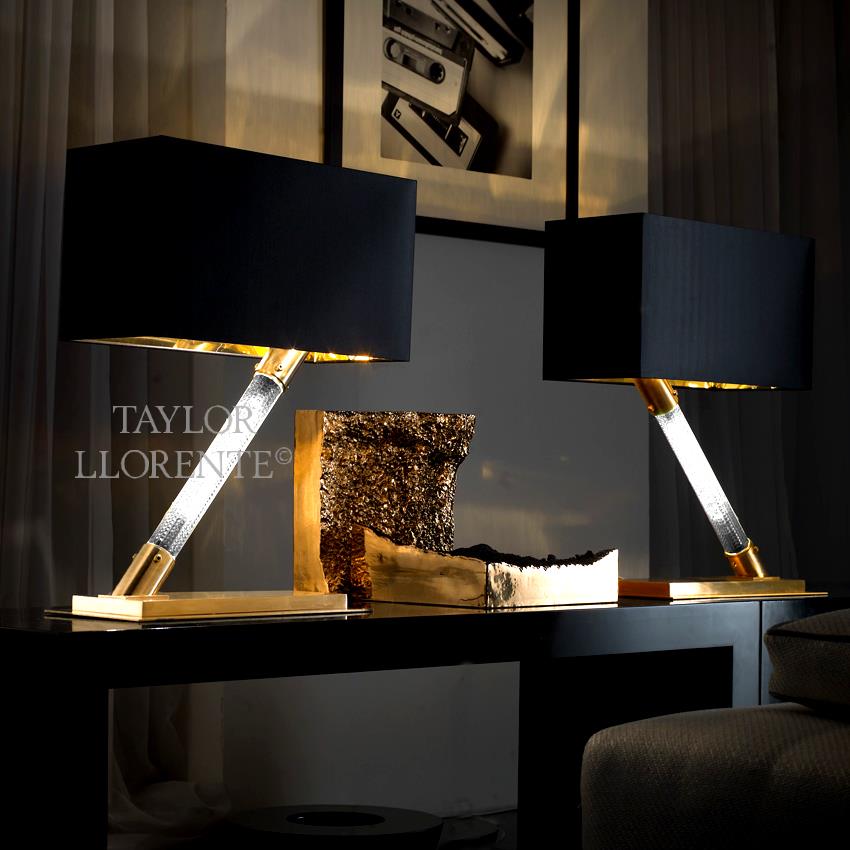 Luxury designer table lamps with modern cut crystal base design and brass metal detailing.