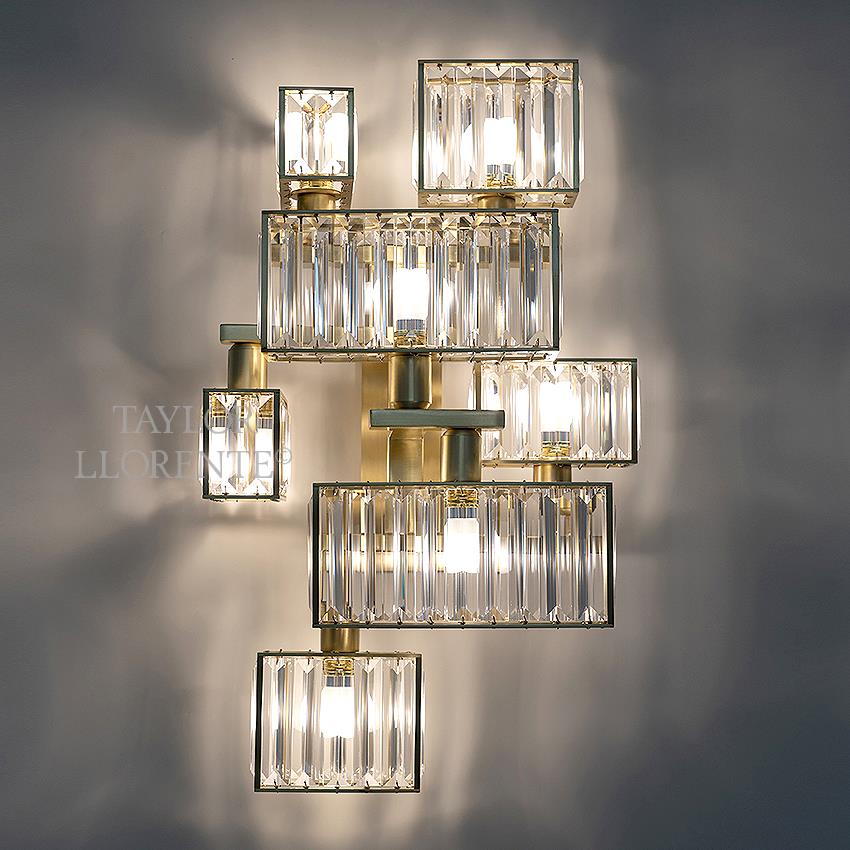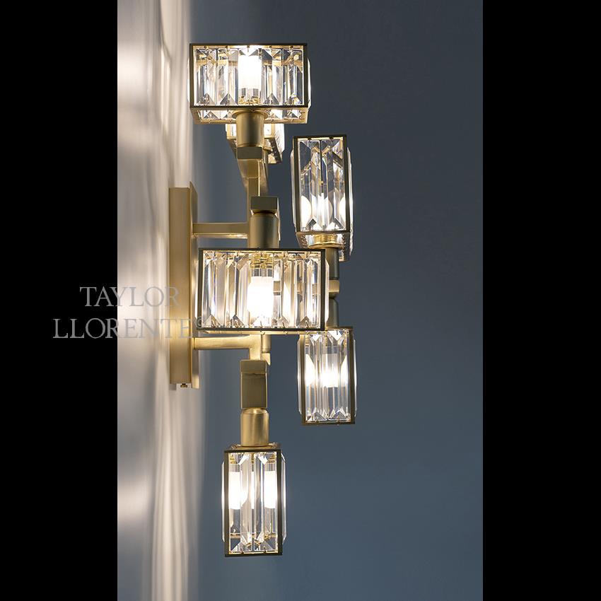 Magnificent and luxurious Art Deco inspired contemporary wall light with linear brass structure and panelled deco style cut crystal glass.