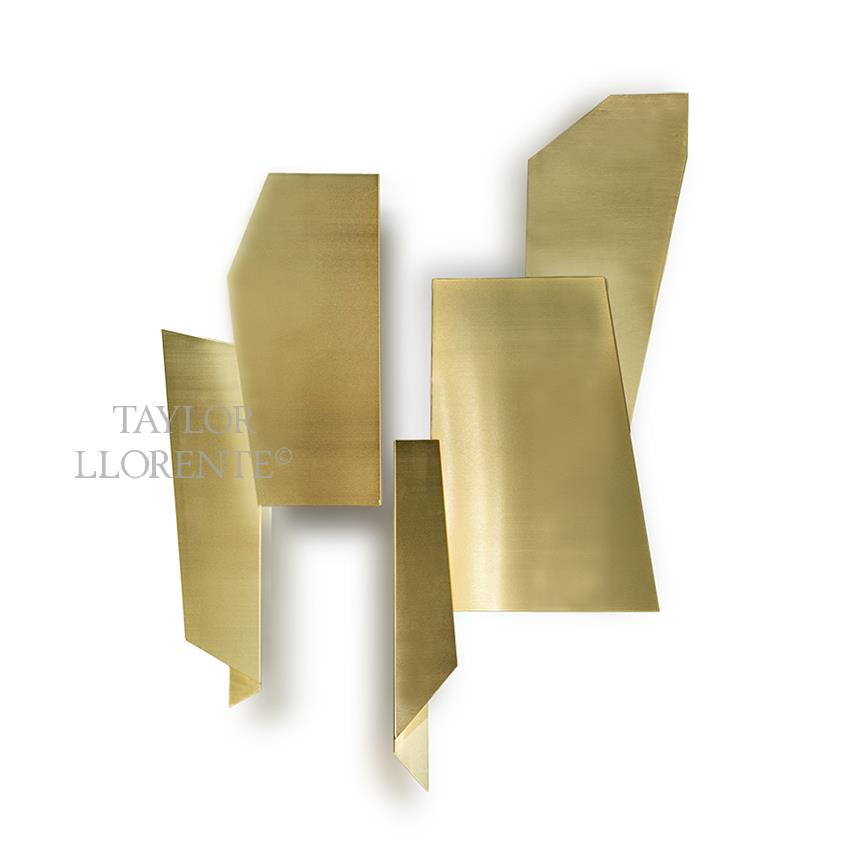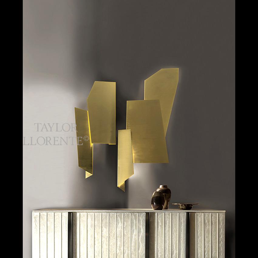 Large architectural sculptural wall light installation created in luxurious matt gold metal structure.
