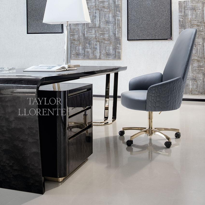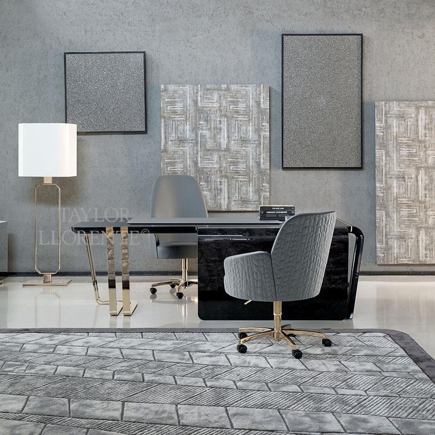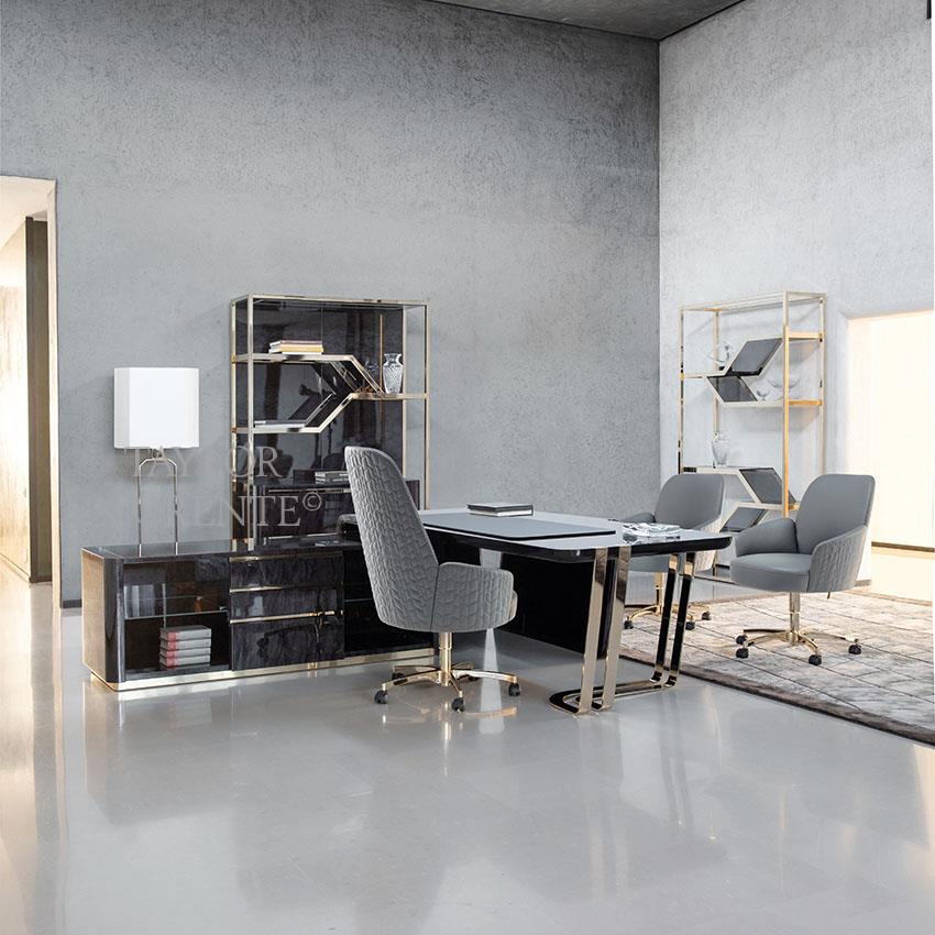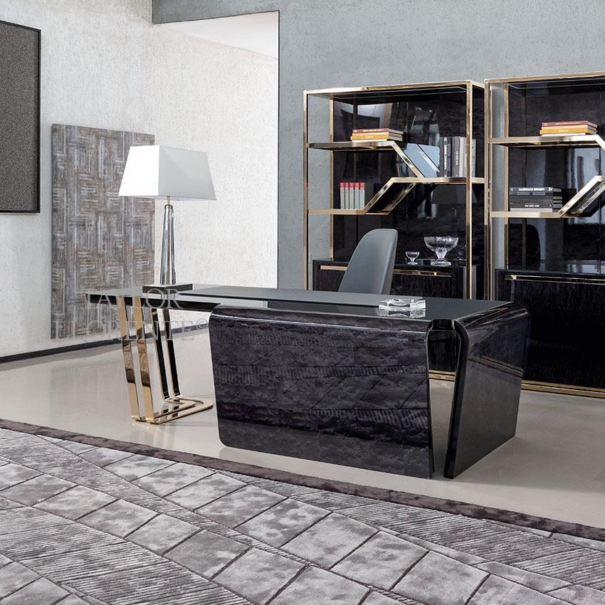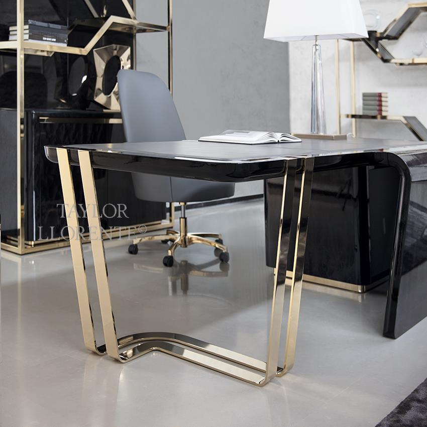 A High end architectural stylised desk created in exquisite and rare black African burl rosewood. High gloss finish. This sculptural design desk has an asymmetrical shape with one side open with light gold steel structure. Light gold detailing as pictured.