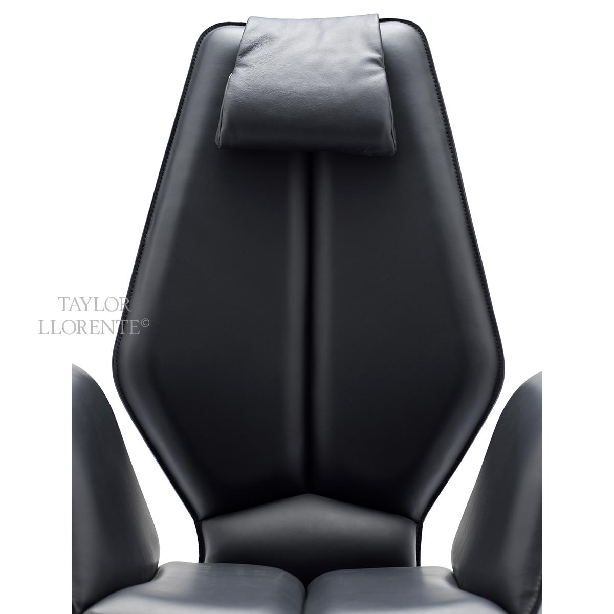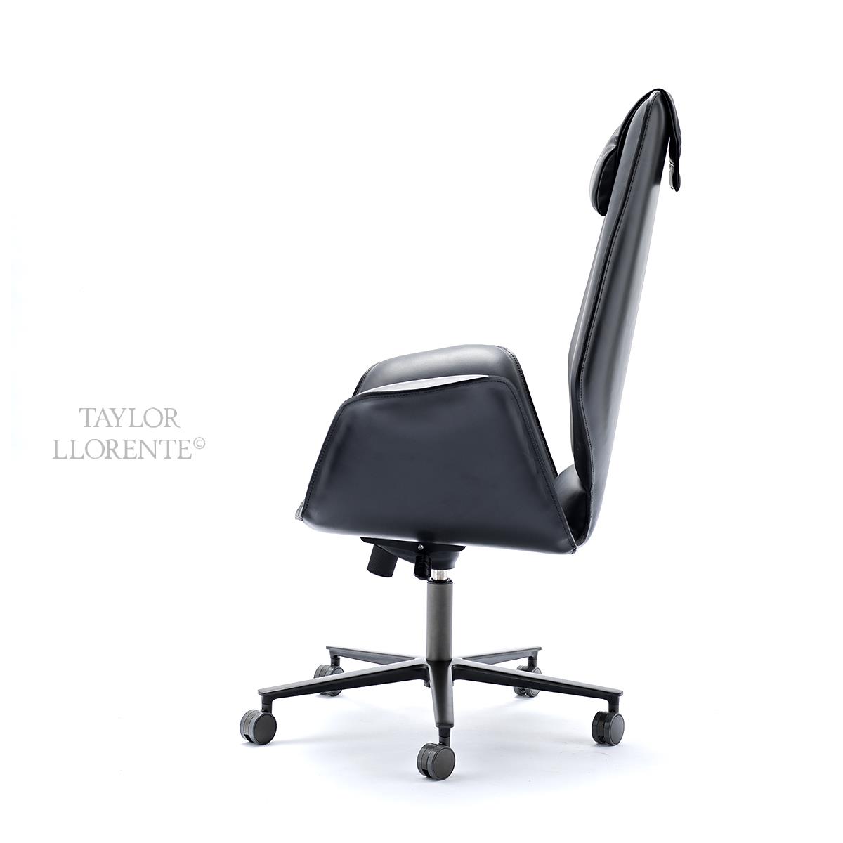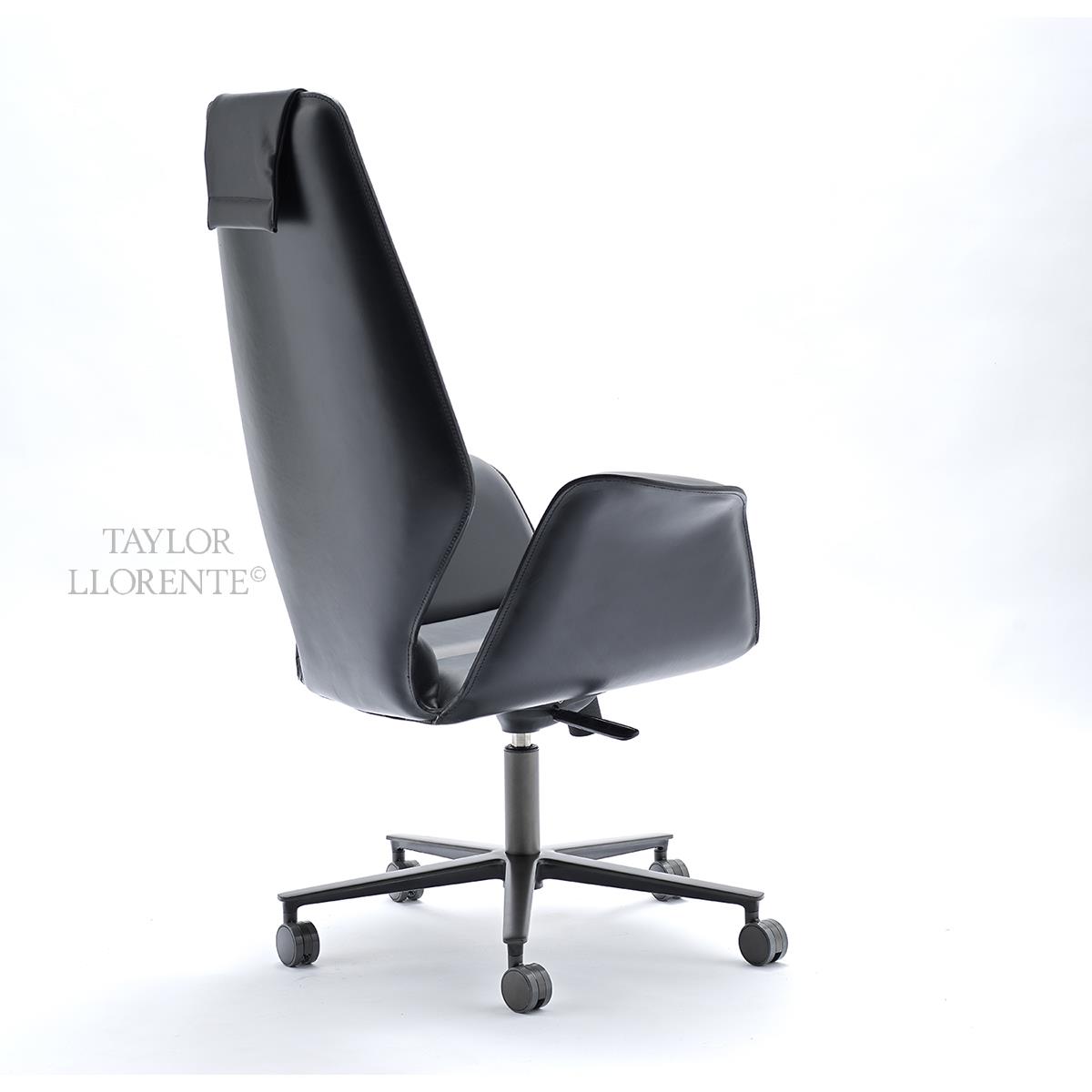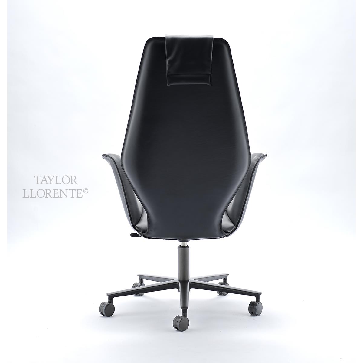 Modern design executive armchair with high backrest. Backrest and arms of armchair is created with a steel core frame and deep padded upholstery in high specification leathers of the collection. This exceptional design armchair has swivel and height adjustable gas lift mechanism.