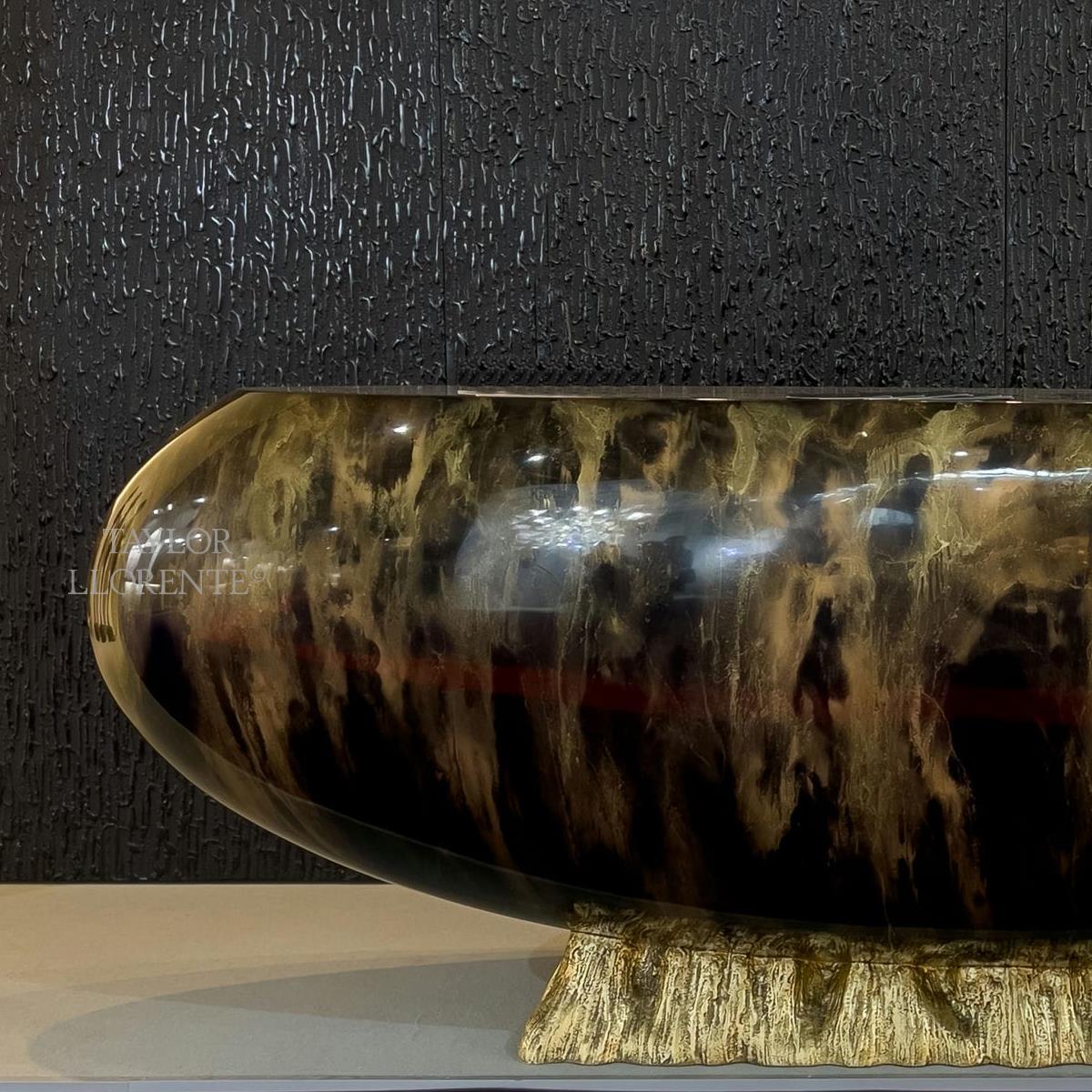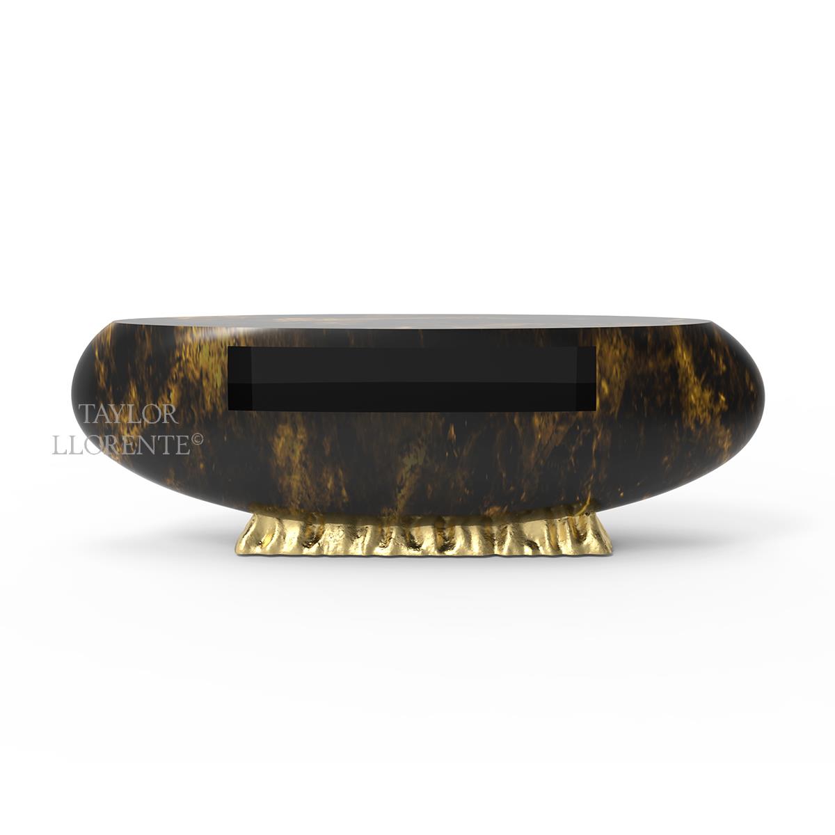 Illustrated in a high gloss special black and gold marble finishes and the base is finished in gold leaf (other metal leaf finishes, for example silver leaf available on request).
