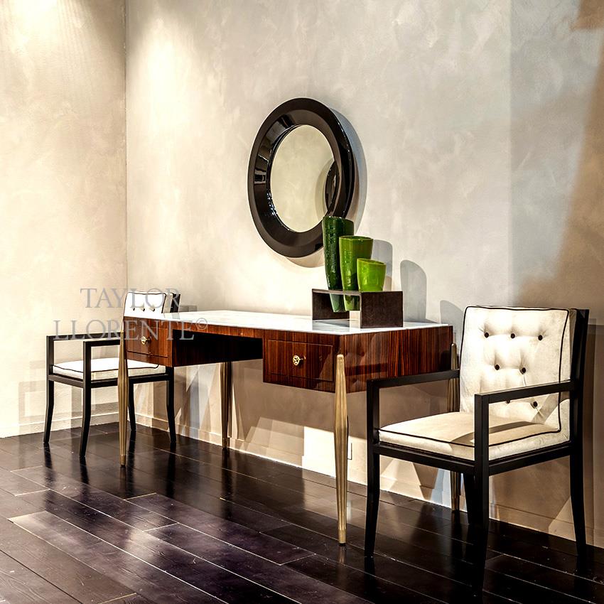 The desk top is Calacatta oro (white marble with gold veining-highlights) and the frame of the desk and drawers are created in highly figured Canaletto walnut. Desk legs in Art deco styled reeded tapering design in bronze finished metal.