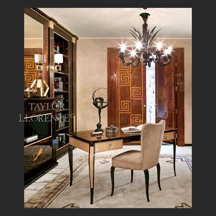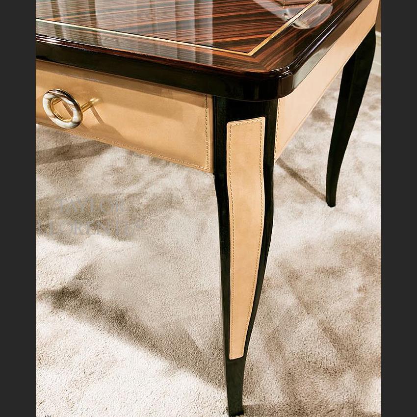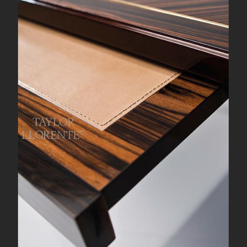 This desk is created in luxurious high gloss Macassar ebony wood and detailed with the highest specification first grade Italian leather.