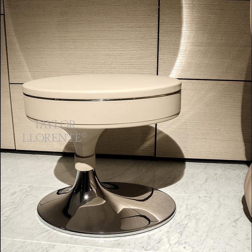 A unique and differentiated leather and metal highly stylised night stand table in highly specified first grade soft Italian leather and stylised sculptural base illustrated in chrome finish.