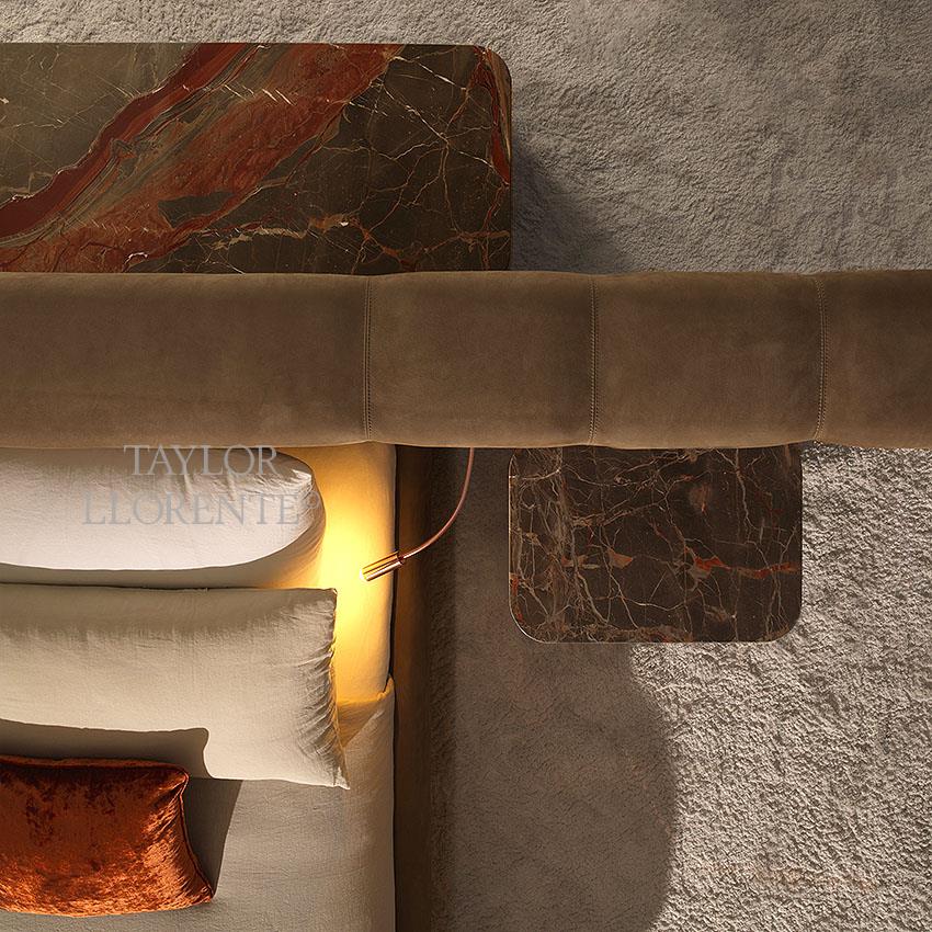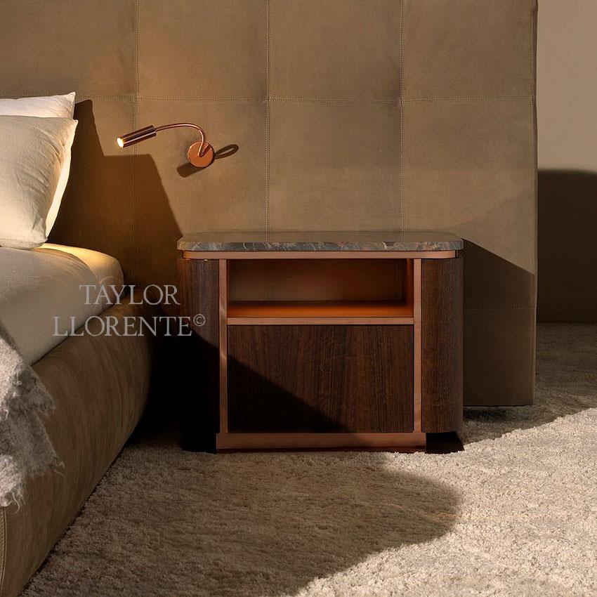 Priced and illustrated here in matt Kalu wood exterior and lacquered interior. Marble category A top with metal finished detailing in copper. One open space above and 1 large drawer below.