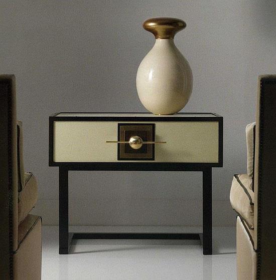 Black opaque hand lacquered brass side table with single drawer. A rare hand worked piece with exceptional detail. Opaque black lacquered brass structure with natural brass details. Top with brass stud screw detail on parameter. Ivory hand lacquered wood with drawer. Part of a unique, couture and artisan furniture collection.