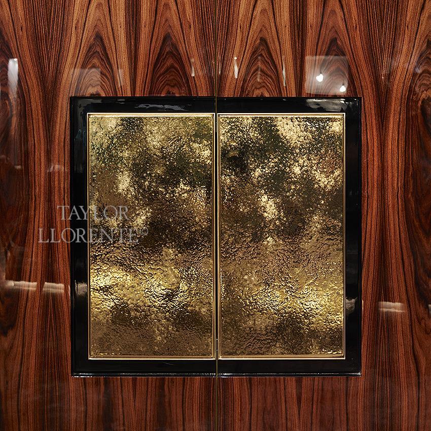 An exquisite tall cabinet created as pictured in highly figured Rosewood. This cabinet is designed with decorative gold ceramic detail on the front of the cabinet doors. Details in brass as pictured.