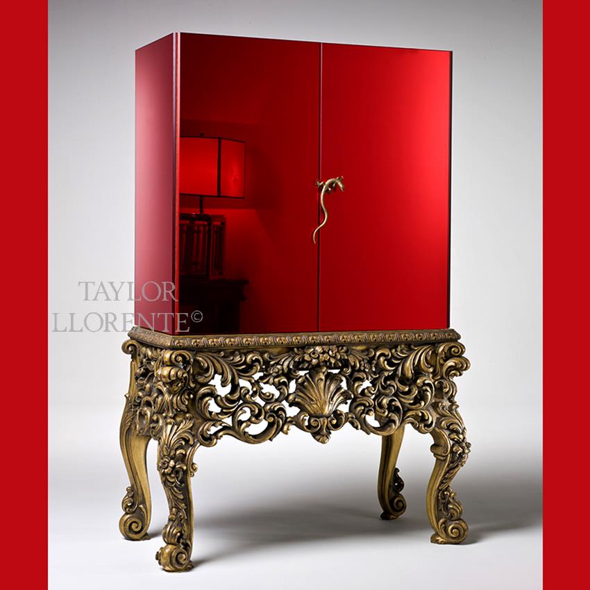 The upper body of the cabinet is shown covered in red mirror glass. Handles with a highly stylised, naturalistic gecko creature in brass.
