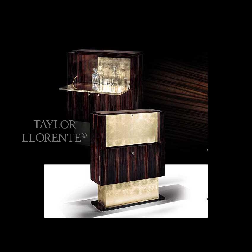 Art Deco inspired highly figured macassar ebony and hand applied gold leaf bar cocktail cabinet.