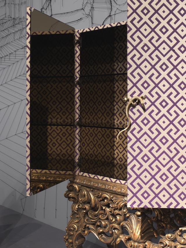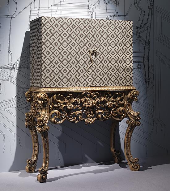 A spectacular 'NEW BAROQUE' cocktail cabinet bar. This rare cocktail cabinet is upholstered in fabric with the stand of the cabinet in hand finished and carved antique gold.
