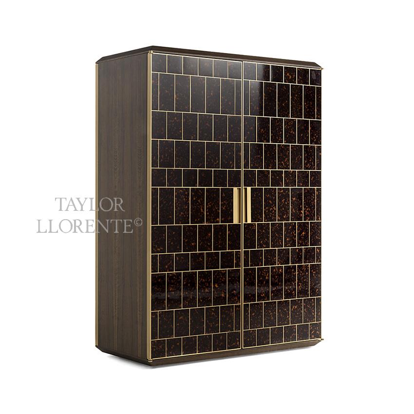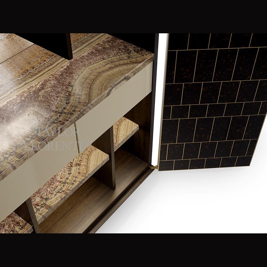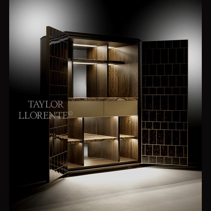 A super luxurious and extravagant bar cocktail cabinet. The cabinet doors inside and out and created with a uniquely developed cellulose acetate squares inlaid in a matt polished brass. Internally the divisions are created in Kalu wood with marble shelving and leather fronted drawers.