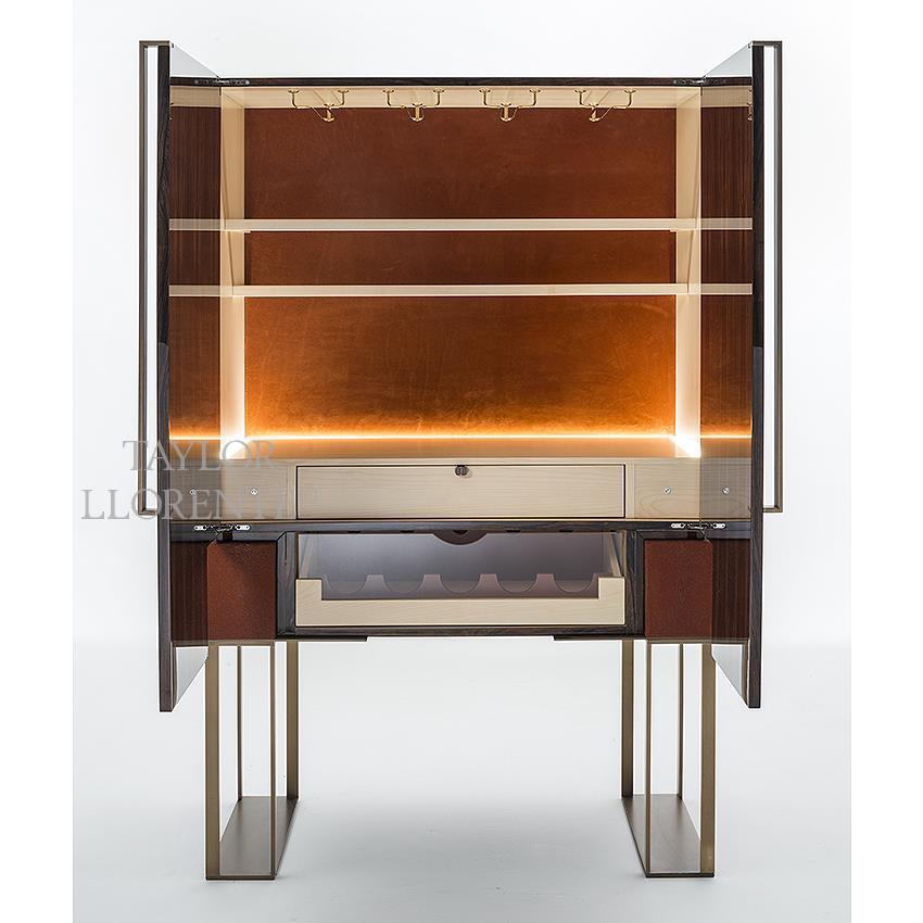 Unique and differentiated bar cocktail cabinet created in rare ‘green’ macassar ebony wood in a high gloss finish (also available in satin finish with a slight down charge).